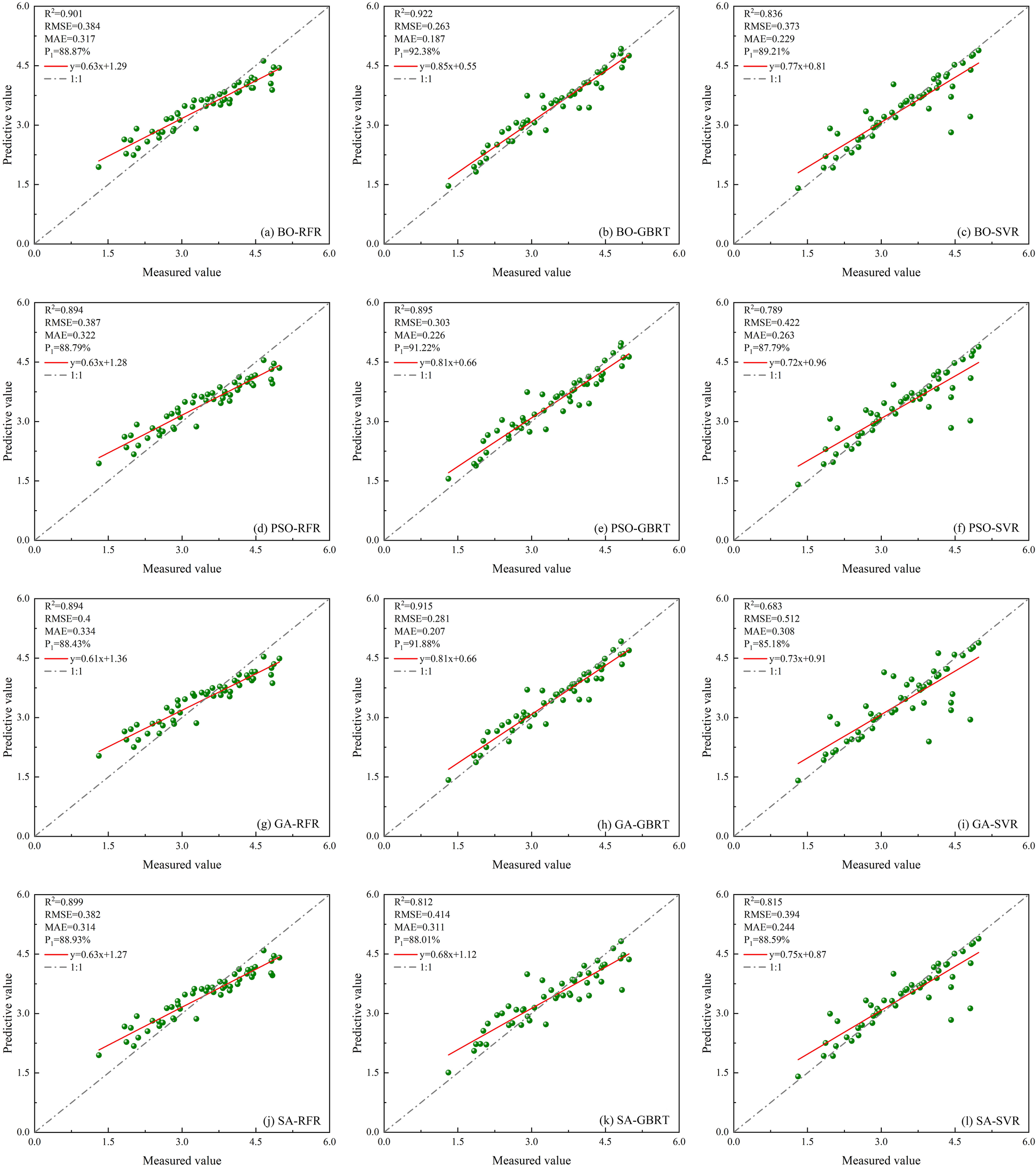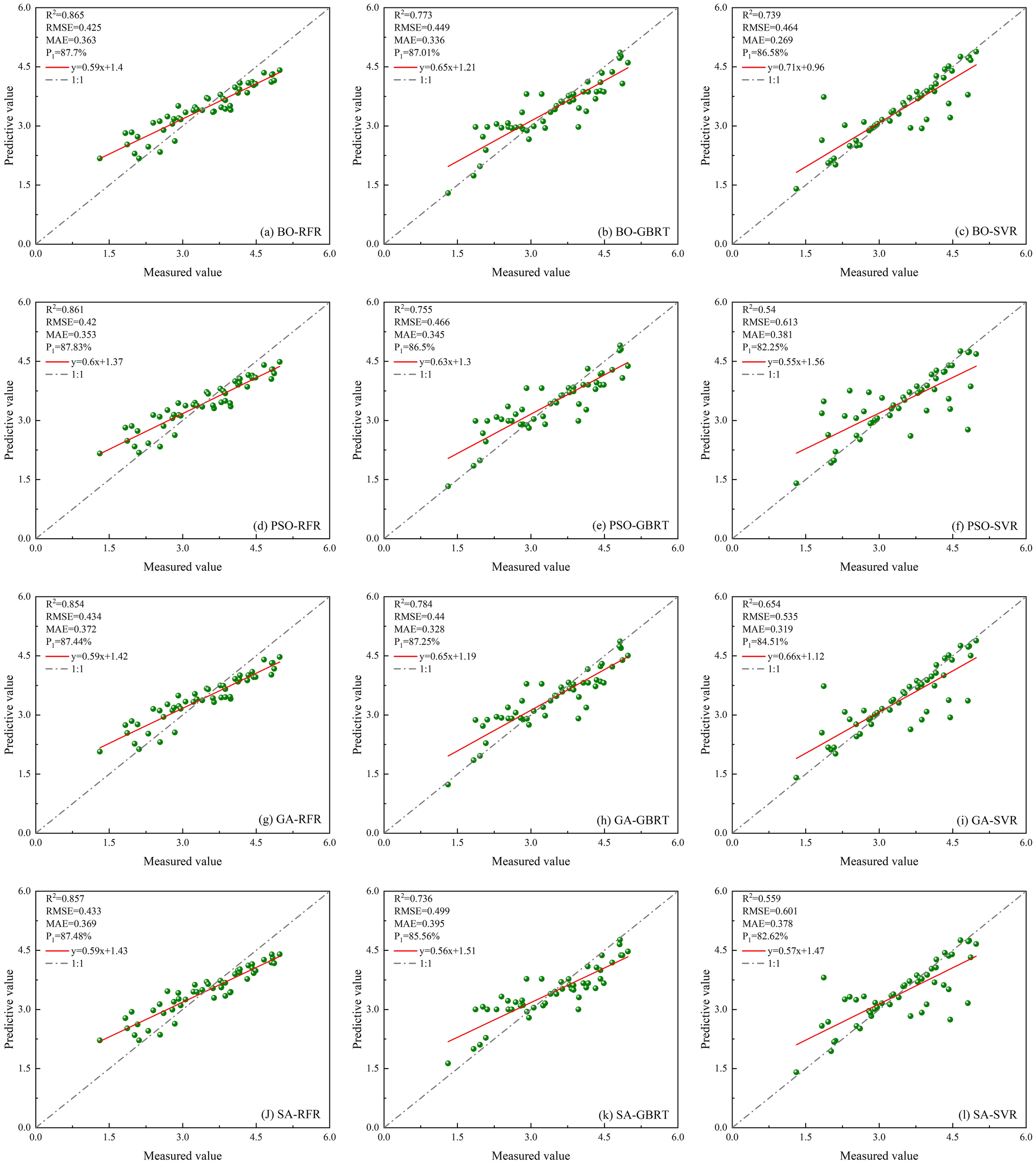 In this research, we utilized several optimization techniques, including the BO, PSO, GA, and SA, to enhance the RFR, GBRT, and SVR models. The definitions of each optimization parameter for these models are detailed in Table 1.