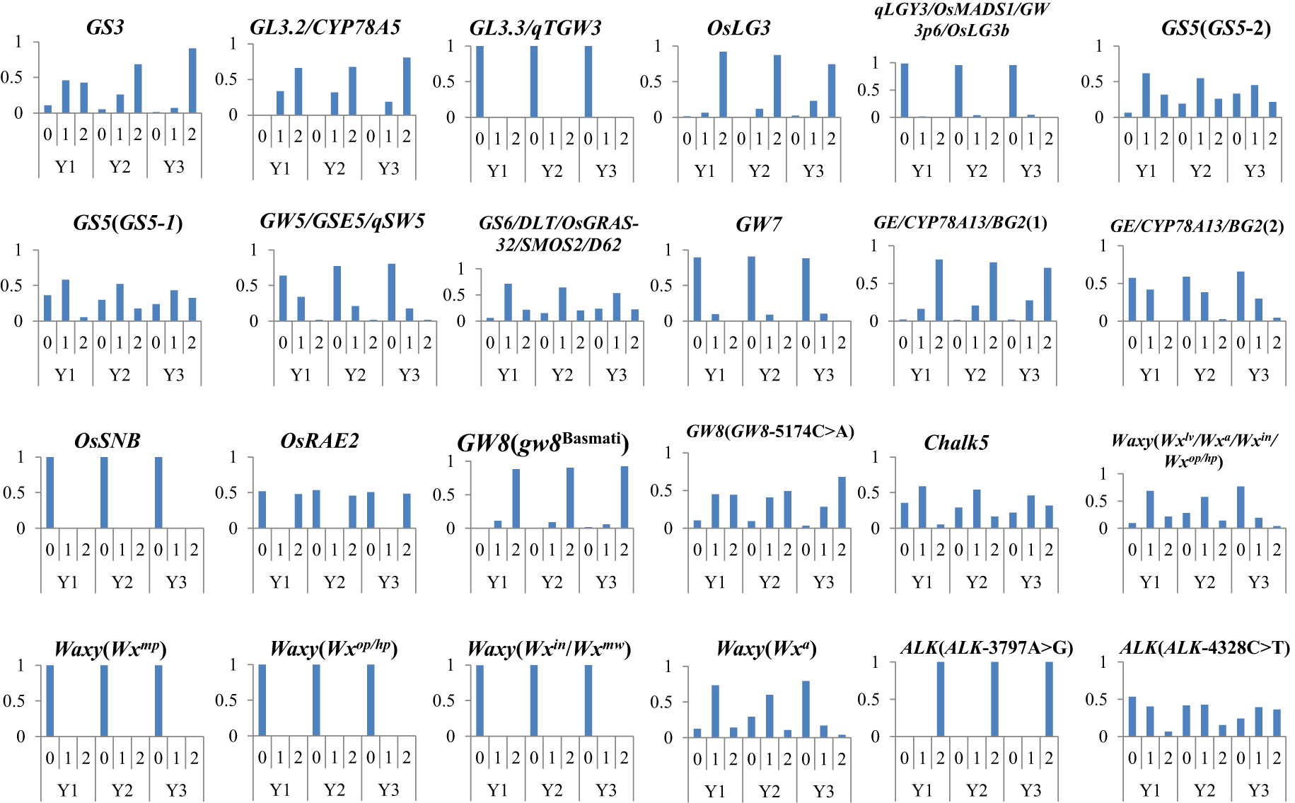 The variation allele frequency of genes affecting AQ and CTQ across different eras. The vertical axis represents frequency. Y1 represents varieties before 2000, Y2 represents varieties from 2001 to 2010, and Y3 represents varieties from 2011 to 2020 (Supplementary Table S3). “0” represents homozygous genotype (reference genotype), “1” represents heterozygous genotype, and “2” represents alterant genotype. AQ, appearance quality; CTQ, cooking and taste quality.