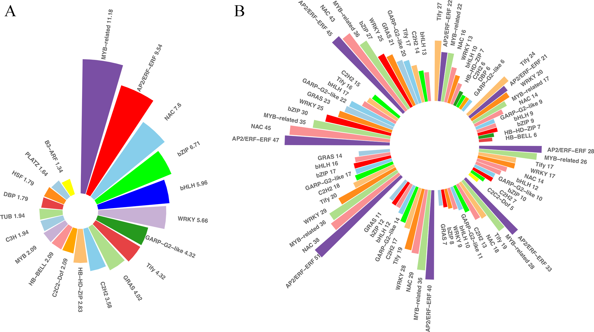 Differentially expressed transcription factors (TFs). (A) Bar plots showing the distribution of the top 20 differentially expressed TFs across the differentially expressed genes (DEGs). (B) Bar plots showing the distribution of the top five differentially expressed TFs at each time point.