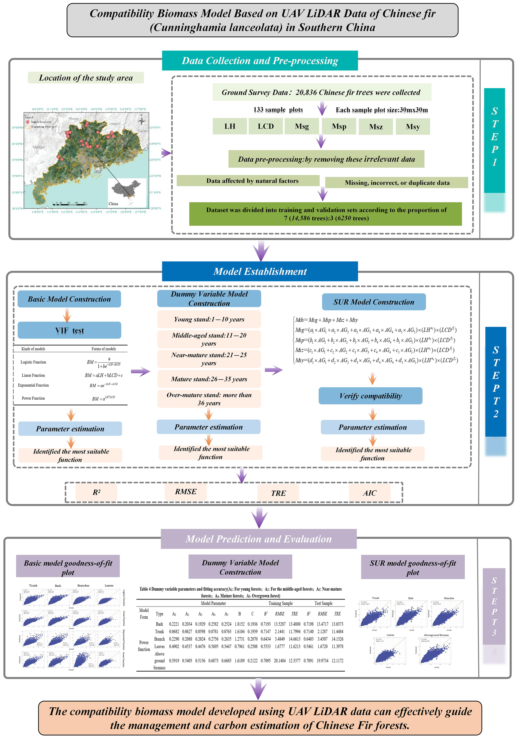 Forest biomass can be divided into aboveground and belowground biomass, with the aboveground portion further subdivided into four components: trunk, bark, branches, and leaves. Previous studies have often modeled these components independently to achieve the required precision (Jingyang et al., 2016; Lun et al., 2018). However, in forest biomass estimation, data are frequently subject to various errors, leading to discrepancies where the sum of the aboveground biomass components does not equal the total aboveground biomass. If traditional models fail to address these errors adequately, the resulting estimates may be biased, and their statistical power may diminish. In contrast, systems of simultaneous equations can effectively utilize the information within the data, optimizing statistical efficiency to address this issue. To ensure that the predicted sum of biomass components equals the total aboveground biomass (Wang et al., 2017) and to explore the growth conditions of Chinese fir forests at different developmental stages, this study employs nonlinear models, dummy variables, and systems of simultaneous equations. These models link the total aboveground biomass of Chinese fir and its components (including bark, stem, branches, and leaves) with predictive factors derived from LiDAR point cloud data, such as LiDAR tree height and LiDAR crown diameter. For each component, an equation is established, and these equations are combined into a system of simultaneous equations. This approach ensures the integration and consistency of all biomass components, providing a method for a more accurate and comprehensive assessment of forest biomass (Parresol, 1999).