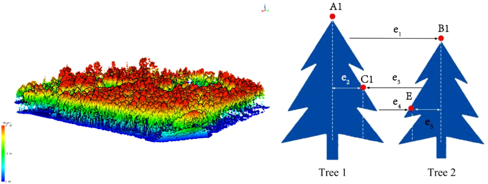 The raw UAV LiDAR data were first visualized and interpreted using Corepore 2.0 software, followed by further interpretation using Lidar360 software. The interpreted LiDAR point clouds were then processed using the distance-based clustering algorithm to extract the radar structural features of the trees (Li et al., 2012). The spacing threshold is a parameter used in the automatic detection of individual trees to define the minimum acceptable distance between two trees. When tree canopies are very close or partially overlap, setting an appropriate spacing threshold helps to distinguish neighboring trees, preventing them from being mistakenly identified as a single tree. The minimum spacing rule is applied during individual tree segmentation in areas with high tree density, ensuring that each tree is independently identified. This is typically achieved by establishing a “buffer zone” around the detection point of each tree, within which no new trees are recognized (as illustrated in Figure 4). This method enabled the segmentation of individual trees within the sample plots and the calculation of key parameters such as tree height, crown width, and diameter at breast height (DBH), which are critical for estimating the biomass of individual tree components.