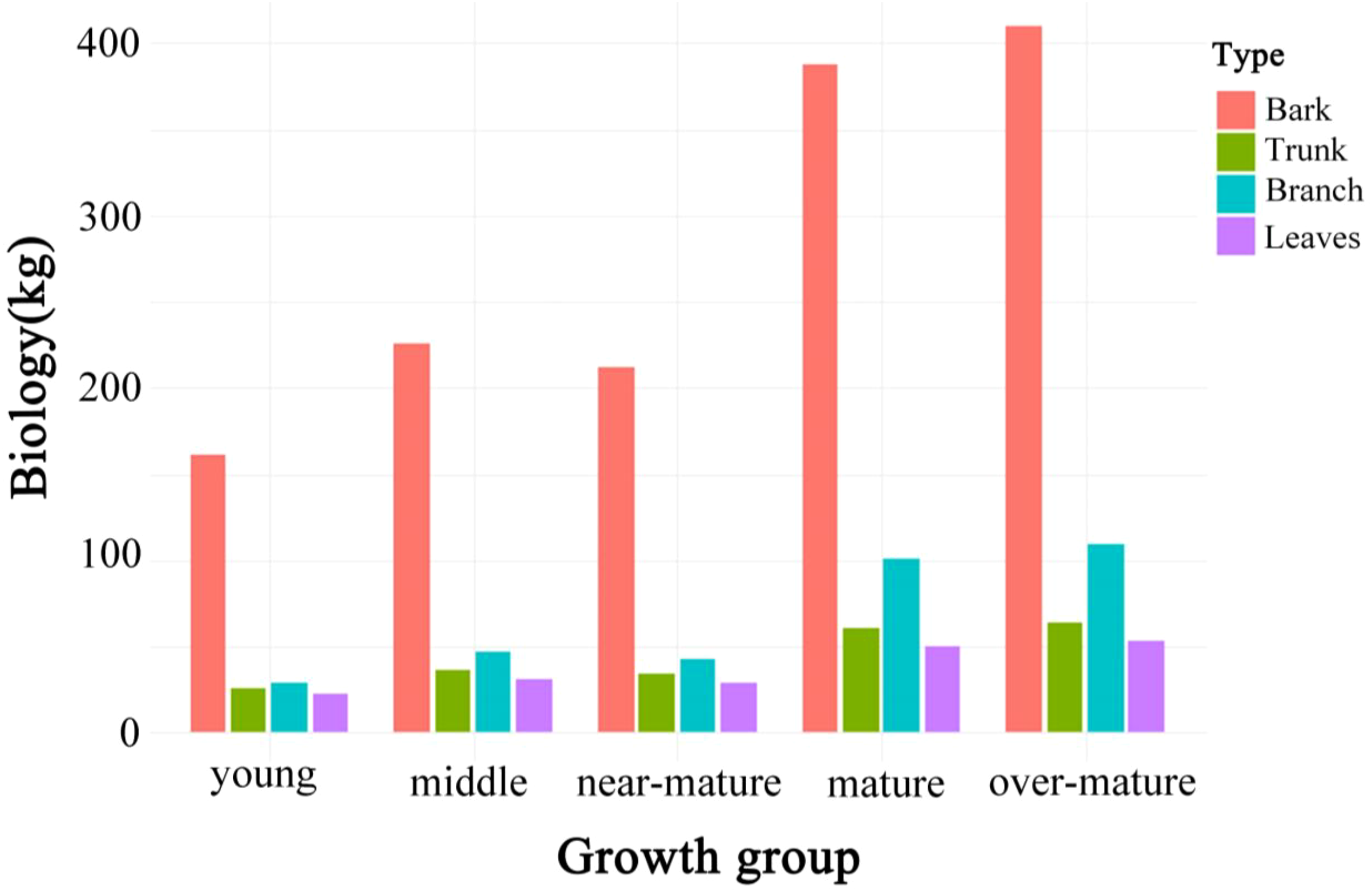 Aboveground biomass distribution across five growth stages of Chinese fir.
