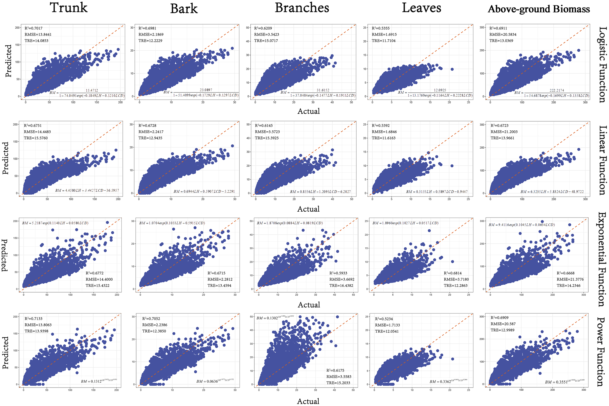 Goodness-of-fit plots of the base models.(The x-axis represents the actual values, and the y-axis represents the predicted values. The R² is the coefficient of determination, RMSE is Root Mean Squared Error, and TRE is Total Relative Error).