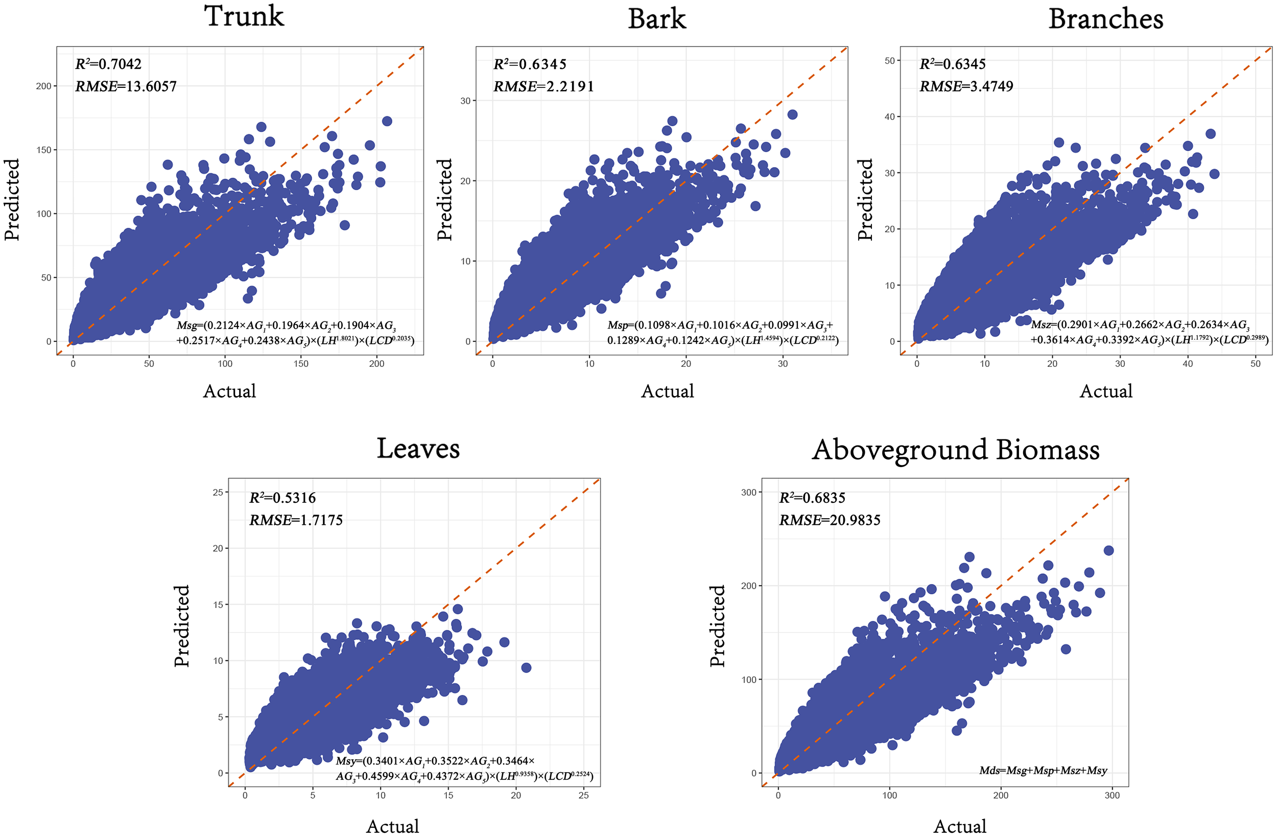 where AG1-5 represents the different age group categories; a, b, c, d, e, and f are the model parameters; LH represents the Lidar tree height; LCD represents LiDAR crown width. Msg represents the Measured trunk biomass; Msp represents the Measured bark biomass; Msz represents the Measured branch biomass; Msy represents the Measured leaf biomass; Mds represents the Measured total aboveground biomass.