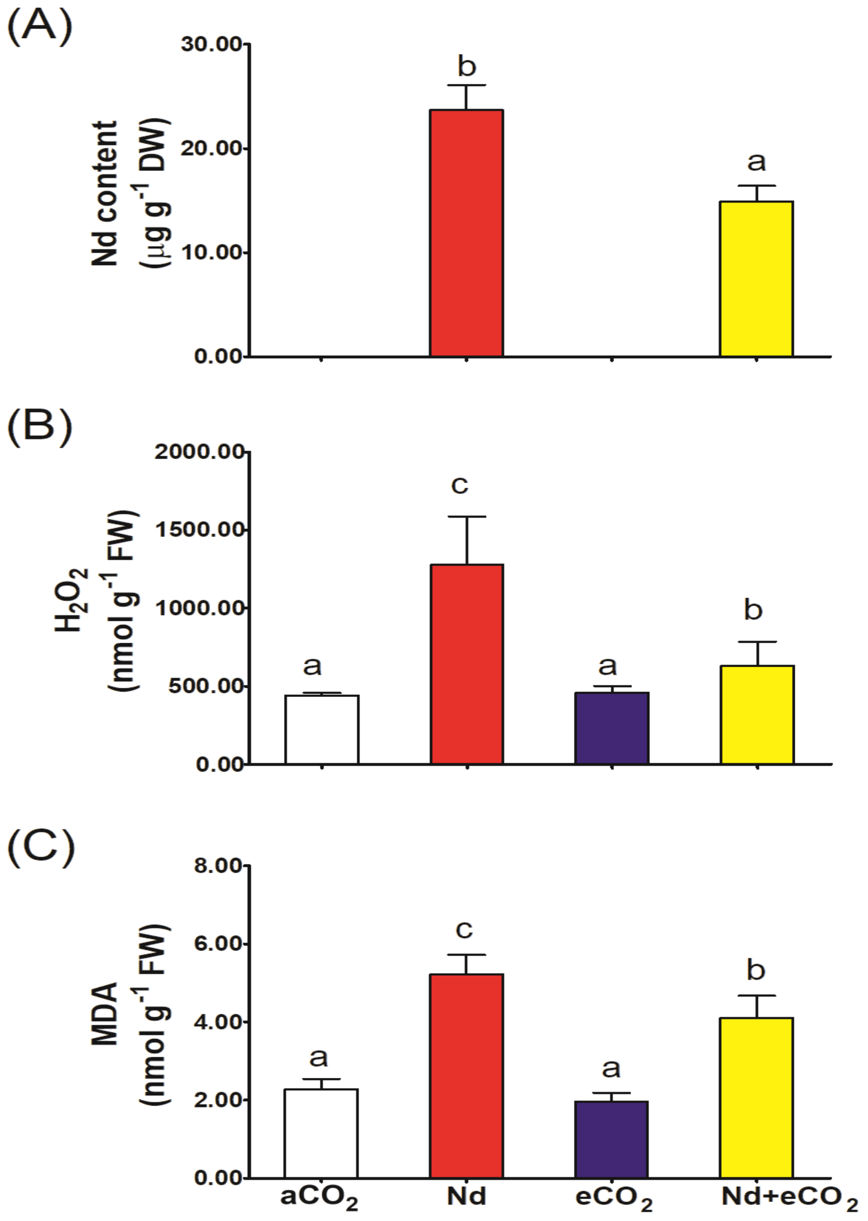 4.2 Accumulation of Nd in wheat plants induces less oxidative damage under eCO2 environment