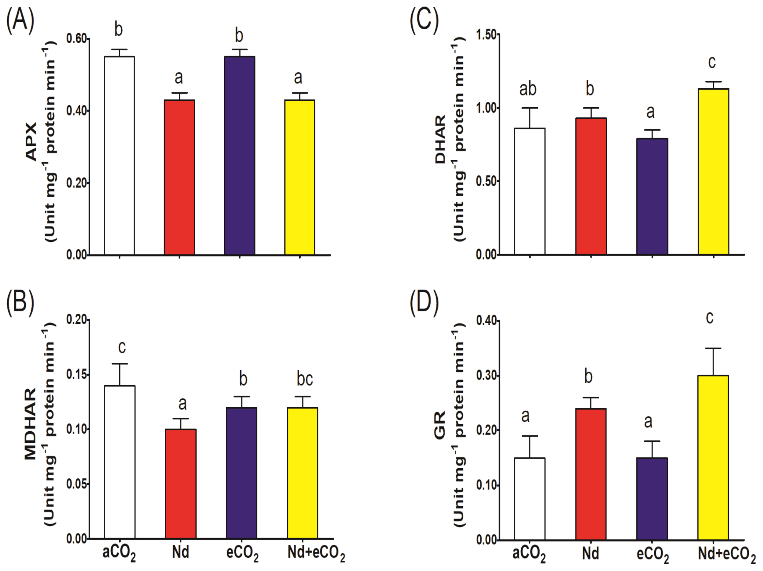 Effect of neodymium (Nd), elevated CO2 (eCO2) and their combination (Nd+eCO2) on the activities of the enzymes of ascorbate-glutathione (ASC-GSH) cycle (unit mg-1 protein min-1) in shoots of 4-weeks old wheat (Triticum aestivum) plants. (A) APX, ascorbate peroxidase; (B) MDHAR, monodehydroascorbate reductase; (C) DHAR, dehydroascorbate reductase; (D) GR, glutathione reductase. Each value is the mean of 5 independent replicates and the vertical bars demonstrates the standard error. Similar lower-case letters on the bars, within the same graph, indicate non-significant difference at the 0.05 probability level as indicated by Tukey’s multiple range tests.