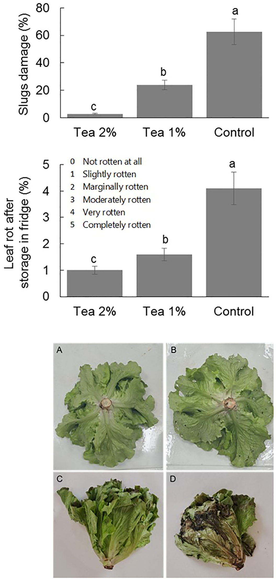Slugs damage (upper panel) and leaf rot after twelve days of fridge conservation (middle panel) of lettuce at the end of second cycle without and with the application of compost tea at two concentrations. Different letters indicate statistically significant differences (ANOVA Tukey test; P < 0,05). Pictures shows the damage caused by snails in the 2% compost tea (A), in the control (B), and the leaf rot after one week of storing the lettuce in the refrigerator at the end of the second cycle with the application of compost tea at 2% (C), and without application (D).