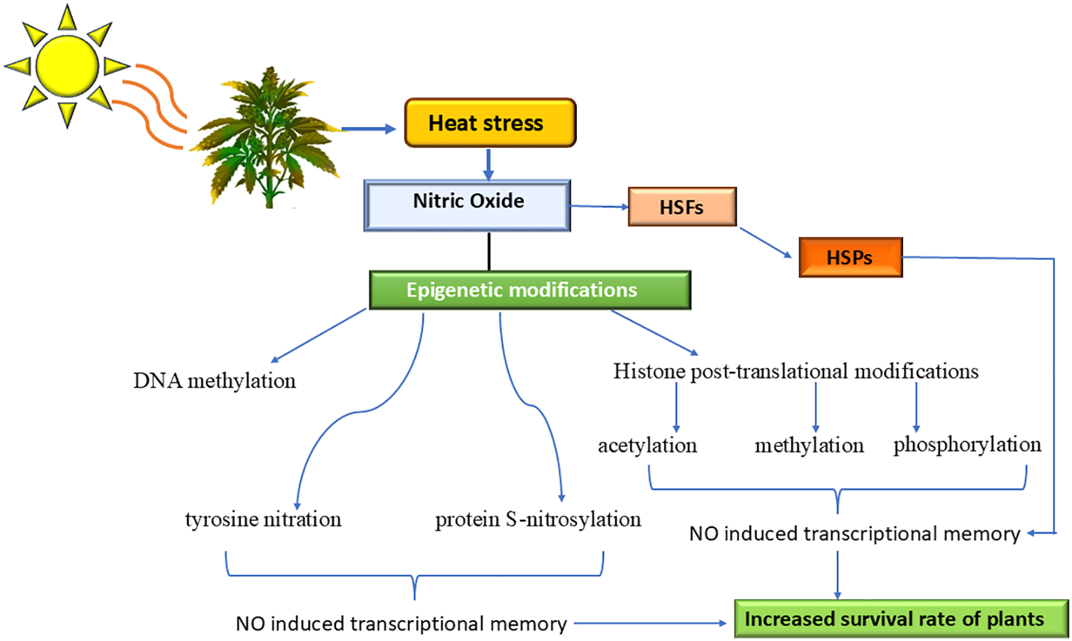 Investigating the synergies or antagonisms between NO and hormones, secondary messengers, or other signaling molecules is essential for a holistic understanding of plant responses to recurring heat stress events. Understanding how NO may impact gene expression to generate thermomemory is made possible by epigenetic modifications, which play a role in memory formation.