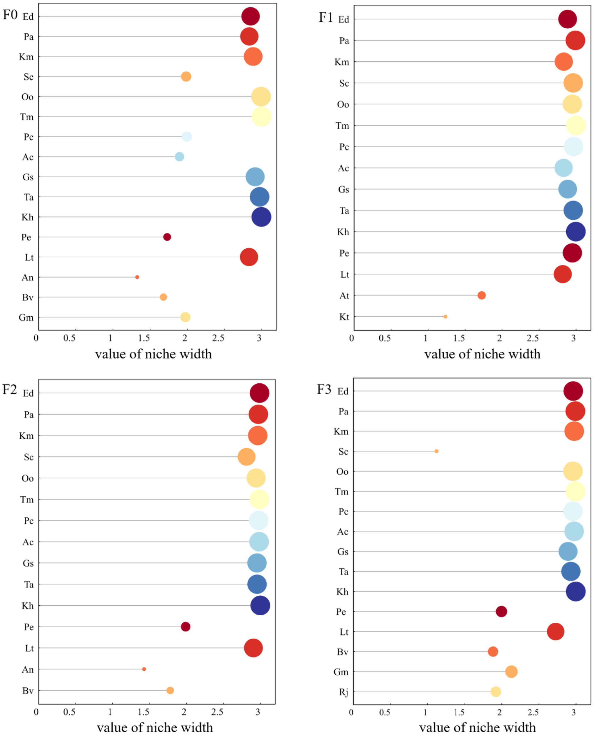 The ecological niche overlap values of the main species of alpine meadow plants under different levels of litter inputs were significantly different (Figure 3). In F0, there were 120 pairs of 16 species, 62 pairs (51.67%) of ecological niche overlap values ≥0.950; 10 pairs (8.33%) of 0.95~0.90; 38 pairs (31.67%) of 0.90~0.50; and 10 pairs (8.3%) of ≤0.5. In F1, there were 105 pairs of 15 species, 81 pairs (77.14%) of ≥0.950; 16 pairs (15.3%) of 0.90~0.95. In F2, 15 species totaling 105 pairs, with 82 pairs (78.1%) of ecological niche overlap values ≥0.950, 12 pairs (11.43%) of 0.90-0.95, and 11 pairs (10.48%) of ≤0.90. In F3, 16 species totaling 120 pairs, with 10 pairs (8.3%) of ecological niche overlap values ≥0.950; with 76 pairs (63.33%) of ≥0.950; 11 pairs (9.47%) of 0.90~0.95; 24 pairs (20%) of 0.899~0.50; and 9 pairs (7.5%) of <0.5.