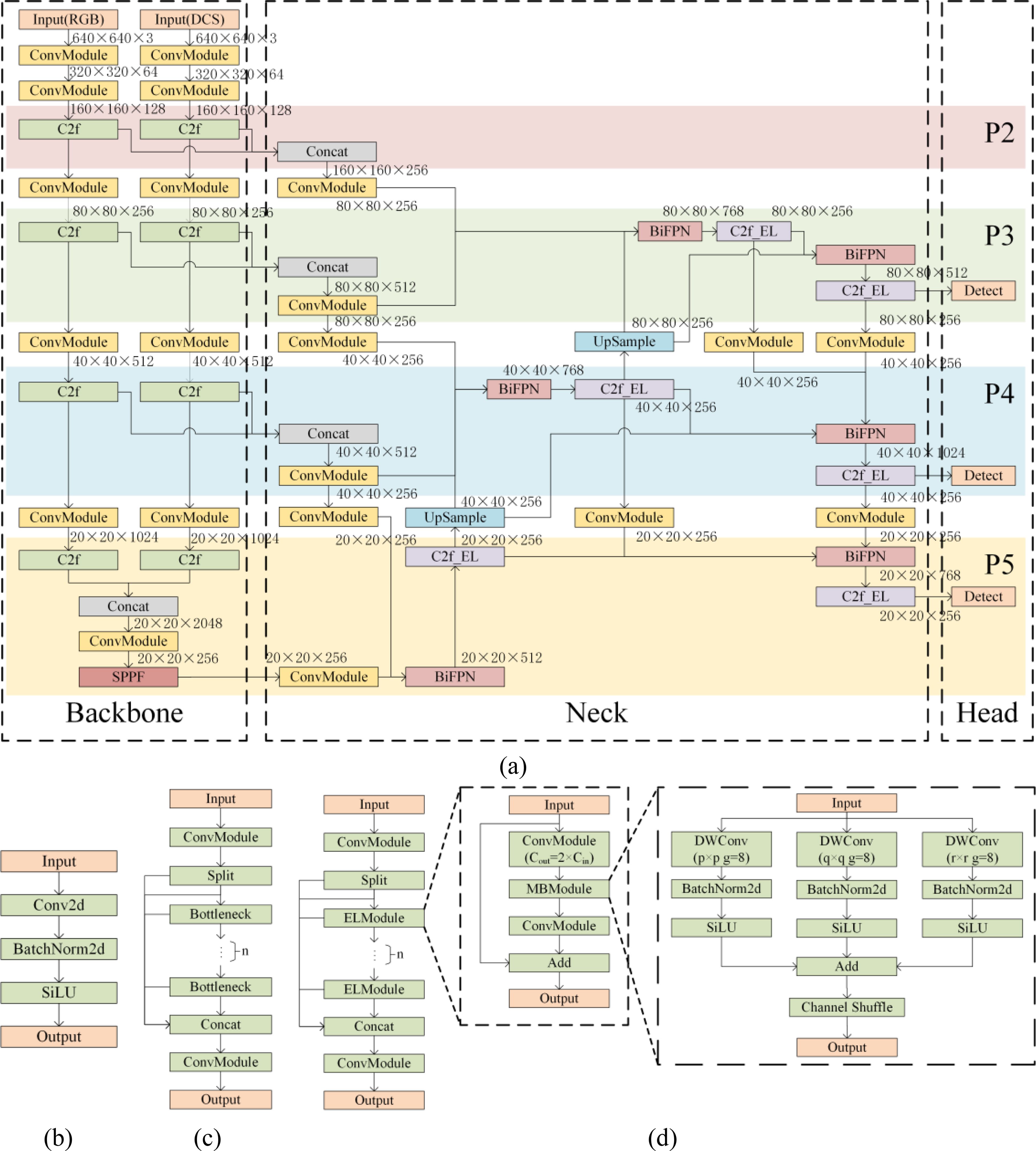 The model creates two backbone branches, as illustrated in Figure 10, to process RGB and DCS images independently, allowing for the simultaneous extraction of features from each branch’s images. BiFPN-Efficient-Lighting-Feature-Pyramid-Network (BELFPN) is a lightweight and efficient structure that is proposed for more effective feature fusion at the neck part. The primary components of this structure are C2f_Efficient-Lighting (C2f_EL) and BiFPN (Yang et al., 2024). The BiFPN may do multi-scale feature weighted fusion by accepting multiple inputs.