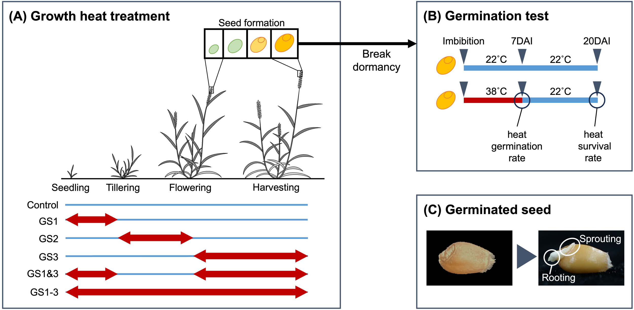 The first objective was to evaluate the impact of heat exposure during the growth period on germinability. In our previous studies, the effects of heat exposure at different growth stages from seedling to maturity, on yield-related traits and metabolite accumulation, were evaluated (Matsunaga et al., 2021a, 2021b). Heat exposure at GS2 reduced plant height and grain number, while heat at GS3 shortened the grain formation period and decreased grain weight. Consequently, plants exposed to high temperatures at GS2 and GS3 showed a decrease in yield. However, heat exposure at GS1 increased grain weight without affecting yield. The application of heat treatment at three distinct growth stages (from germination to tillering, from tillering to flowering, and from flowering to maturity) revealed that (1) seed formation is influenced by the timing and duration of senescence initiation, (2) the high temperature during growth results in a diverse range of seed morphologies, and (3) prolonged exposure to elevated temperature during the growth period impedes the progression of senescence during seed formation, thereby facilitating high-temperature acclimation (Matsunaga et al., 2021b). The present study employed the identical heat treatments to ascertain the impact of heat exposure during growth on germinability.