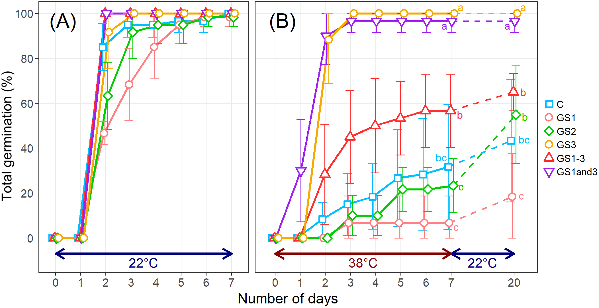The heat germinability of GS2 seeds was lower than that of the control seeds. Since there are two causes for lack of germination at high temperature, death and secondary dormancy (Baskin and Baskin, 2014), the improved germination of GS2 seeds when transferred to 22°C after initial exposure to 38°C during germination indicated that they were likely in secondary dormancy. This suggests that the GS2 treatment may provide seeds with some high-temperature tolerance, though weaker than the GS3 and GS1&3 treatments, and that seeds produced in GS2 growing conditions may not germinate at high temperature but instead shift to secondary dormancy.