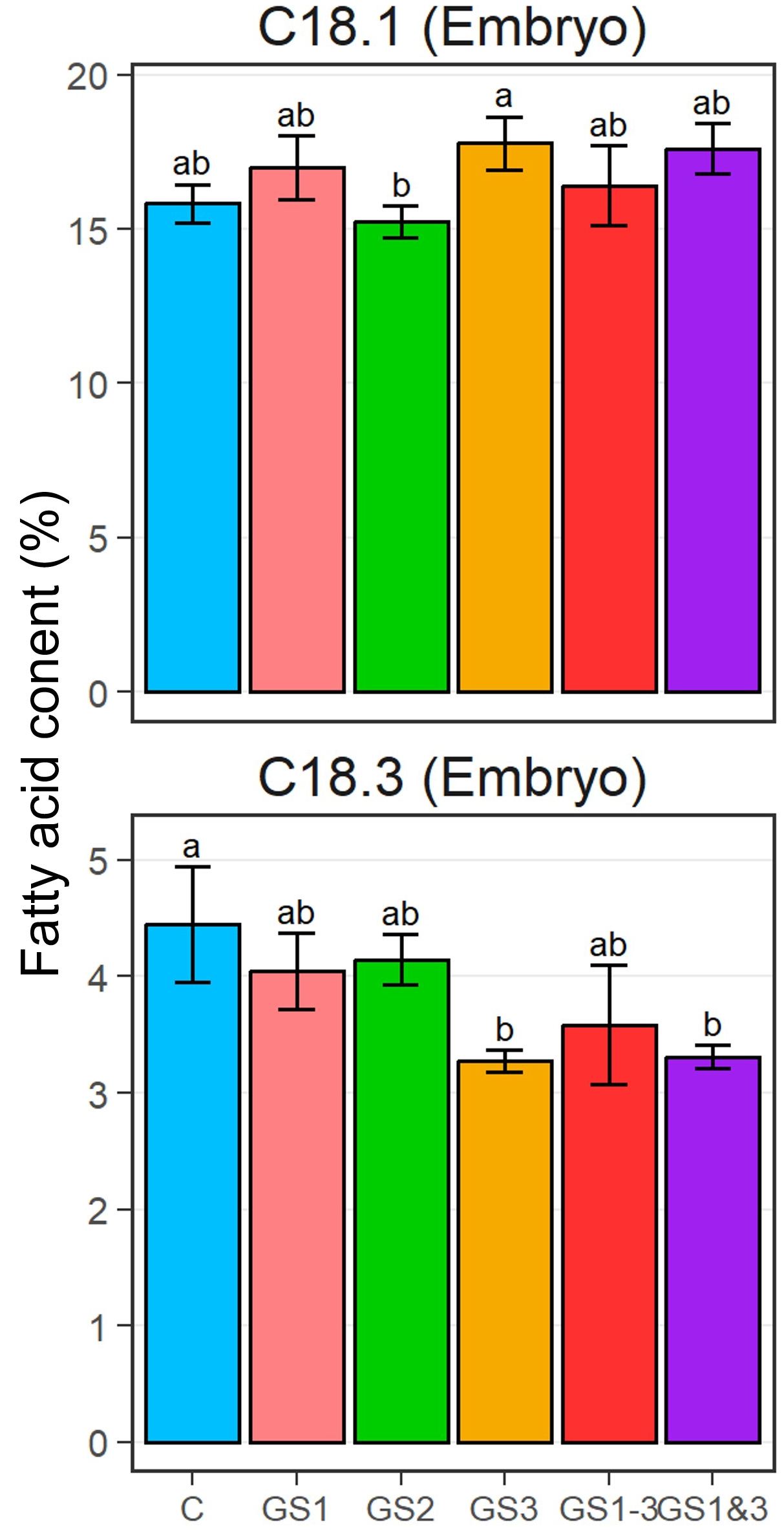For palmitic acid (C16:0), stearic acid (C18:0), and linoleic acid (C18:2) in the seed embryos and endosperms, the differences in fatty acid compositions were not significant among the treatments (Supplementary Table S3). However, significant differences were observed in oleic acid (C18:1) and linolenic acid (C18:3) in the embryos (Figure 5). The C18:1 content of embryos from the GS2 and GS3 treatments were significantly different. Also, the C18:3 content in embryos from treatments GS3 and GS1&3 were significantly lower than in the control.