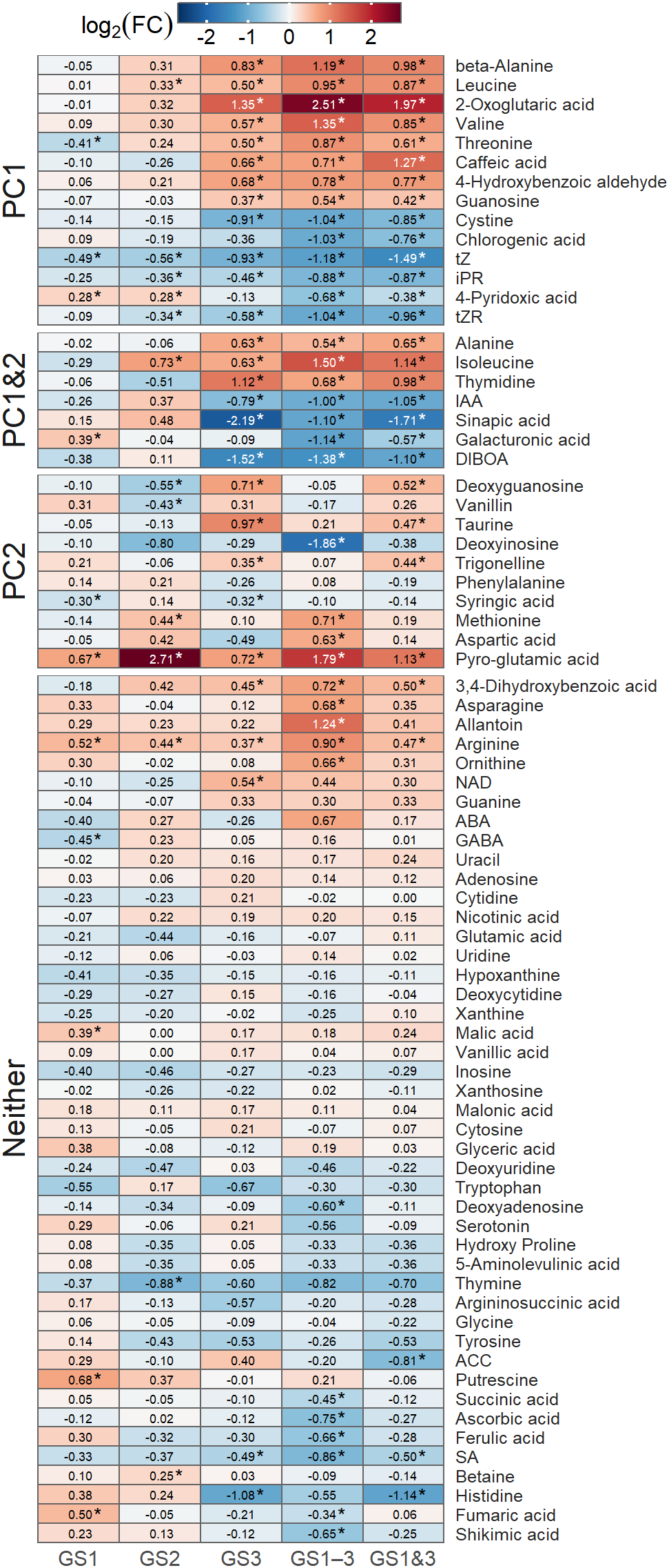Heatmap of logarithms of fold changes in metabolite content [Log2(FC)] compared to the control, in seeds from plants exposed to high temperature at various growth stages. Asterisks indicate significant differences (p < 0.01) from the control treatment, using Dunnett’s method. Groupings indicate whether the metabolite had large loading scores of PC1 or PC2 (see Figure 6). Treatment identifiers are as in Figure 1.