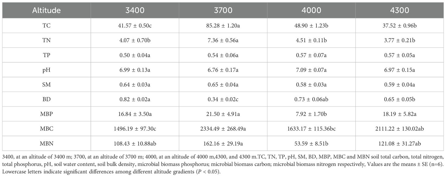 Altitude is one of the important topographical factors. Due to different altitudes, changes in climate characteristics and soil types all lead to differences in soil nutrients (Gilgen and Buchmann, 2009).Therefore, soil is affected by various ecological factors, and complex biological and abiotic factors closely interact to form a soil ecosystem (Denef et al., 2009). In this study, total carbon and total nitrogen first increased and then decreased with the elevation, which is consistent with the research conclusion of (Zhou, 2019). Altitude, as a natural geographical variation, is one of the important factors affecting the distribution of soil carbon and nitrogen (Xie L. L. et al., 2024). Due to altitude, continuous changes in heat, temperature, precipitation, and sunlight occur within the region (Bin et al., 2022). This is consistent with the findings of Gao et al. (2021). The total carbon (TC) and total nitrogen (TN) in the study area appeared at 3700 meters rather than 4300 meters. The main reason is that as the altitude rises to 3700m, human interference (grazing activities) gradually decreases compared to lower altitudes (3400m), soil moisture content gradually increases, and the content of plant litter and organic matter increases, which can provide more nutrients for the growth of soil microorganisms, promote the reproduction and activity of soil microorganisms, accelerate the utilization and mineralization rate of organic matter by soil microorganisms, thereby improving the physical and chemical properties of the soil (Pingree and Deluca, 2018). However, as the altitude continues to rise, wind erosion gradually worsens, the soil layer becomes thinner, the hydrothermal conditions deteriorate, and the shelter conditions decrease, causing significant changes in soil nutrients (Deng et al., 2019). Therefore, the total carbon and total nitrogen content of soil at different altitude gradients shows significant heterogeneity. Soil total phosphorus increased with the elevation (Table 1). A main driving factor seems to be that the degree of soil weathering decreases with the decrease of altitude, because soil phosphorus mainly comes from weathered soil (Helfenstein et al., 2018). Soil microbial biomass first increased and then decreased and increased with the elevation, and the microbial biomass was the highest at 3700 m above sea level (Table 1). The reason may be that the surface soil temperature at 3700 m above sea level is high, which is beneficial to plant growth and there are more exudates from vegetation roots, Higher soil temperature promoted microbial proliferation and increased microbial biomass (Uselman et al., 2000). It is worth noting that at 4300 m, microbial biomass phosphorus, microbial biomass carbon and microbial biomass nitrogen are higher than 4000 m, indicating that microbial biomass is affected by many factors (Ren et al., 2021). With the elevation, its climatic conditions will change (Xu et al., 2013). At the same time, soil microorganisms have a certain physiological adaptability to climate conditions. Although altitude increases will cause temperature drops, microorganisms can maintain balance by reducing metabolic activity (Li et al., 2014). Secondly, the low temperatures in high-altitude areas may increase physiological stress by altering osmotic pressure and reducing the ability to obtain effective nutrients Sun et al., 2025).
