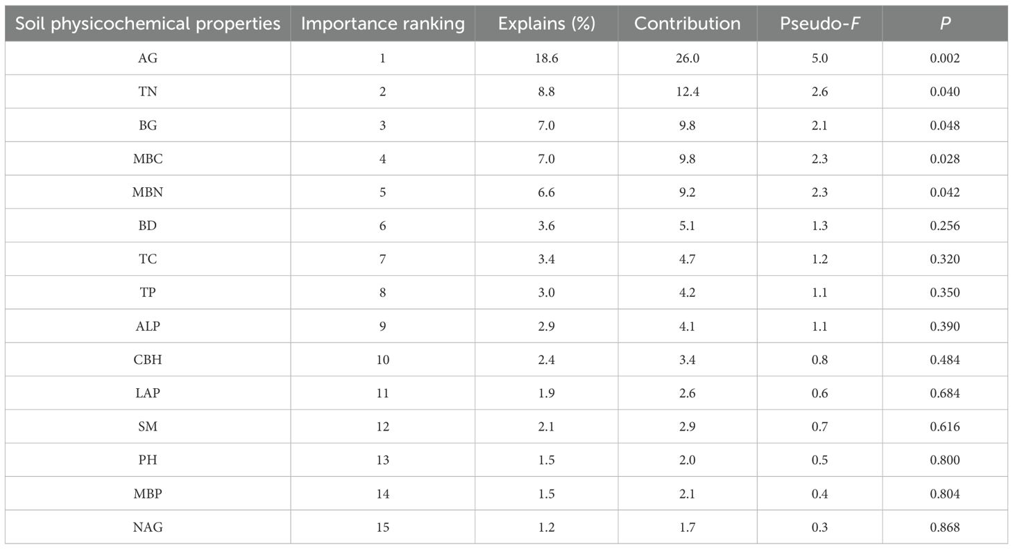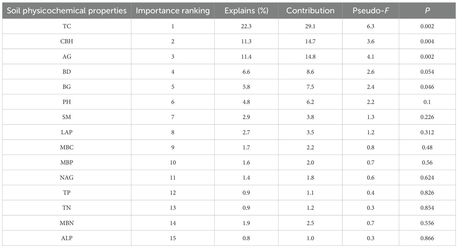The contents of total nitrogen (TC) and total nitrogen (TN) in soil were determined by C and N analyzer (Elementar, Langenselbold, Germany);Total phosphorus (TP) in soil was determined by molybdenum antimony colorimetric method and flow analyzer (Proxima, AMS Alliance, Paris, France); pH measurement: Measure the soil pH from the sample containing the ratio of soil (air-dried) to water of 1:5; Soil moisture content (SM): measure the soil moisture content after drying in an oven at 105°C for 48 h to constant weight; BD: The density (BD) of soil samples was measured by circular knife method and dried at 105°C for 24 hours. Soil microbial biomass carbon (MBC) and microbial biomass nitrogen (MBN) were determined by chloroform steaming-K2SO4 leaching method, and soil microbial biomass phosphorus (MBP) was determined by chloroform steaming-NaHCO3 leaching method (Zhao et al., 2023).