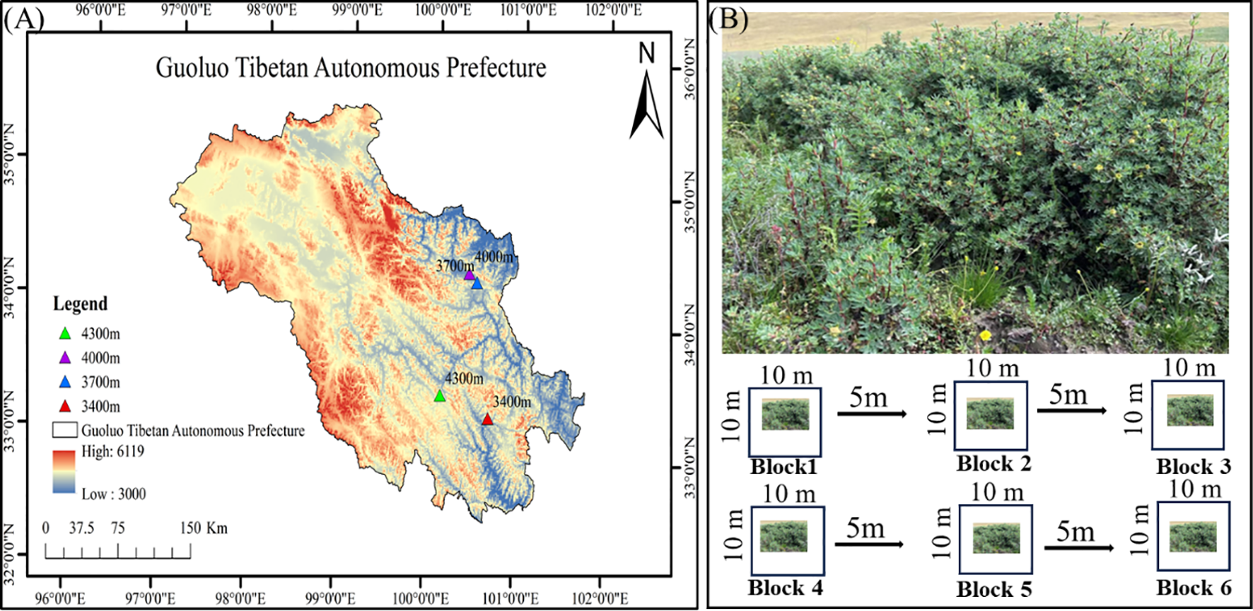 Distribution (A) and sampling method (B) of four experimental sites in Guoluo Tibetan Autonomous Prefecture.