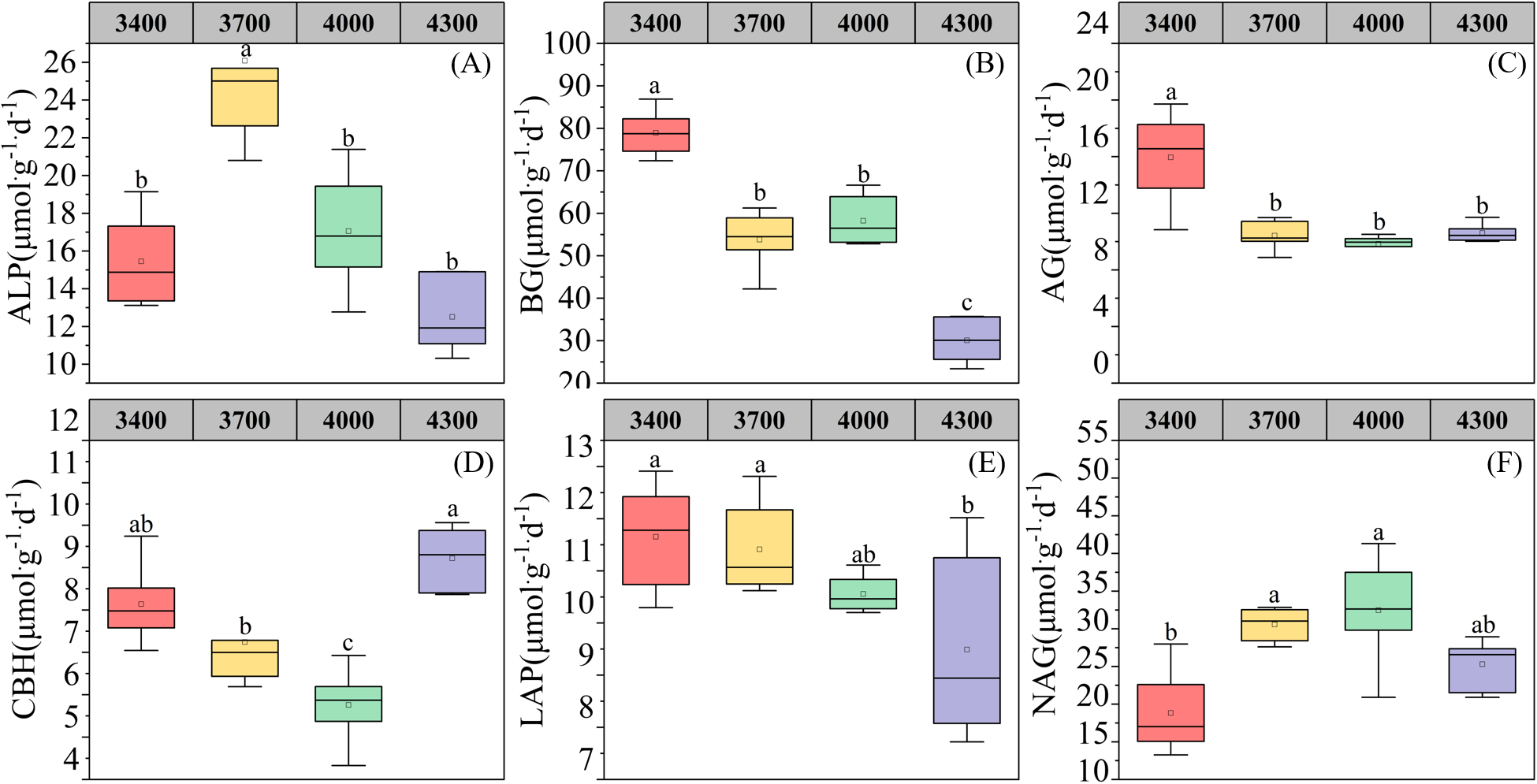 Changes of soil enzyme activities at different altitudes. alkaline phosphatase (A);BG, β-1,4-glucosidase (B); AG,α-1,4-glucosidase (C);CBH, β-D-cellobiosidase (D); LAP, L-leucine aminopeptidase (E); NAG, β-1,4-N-acetylglucosaminidase (F). Different lowercase letters indicate significant differences at the 0.05 confidence level.