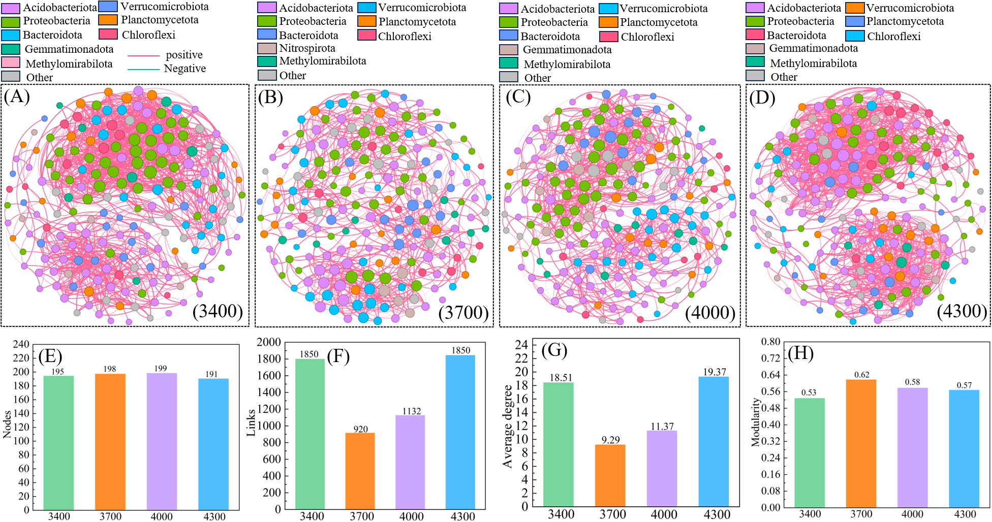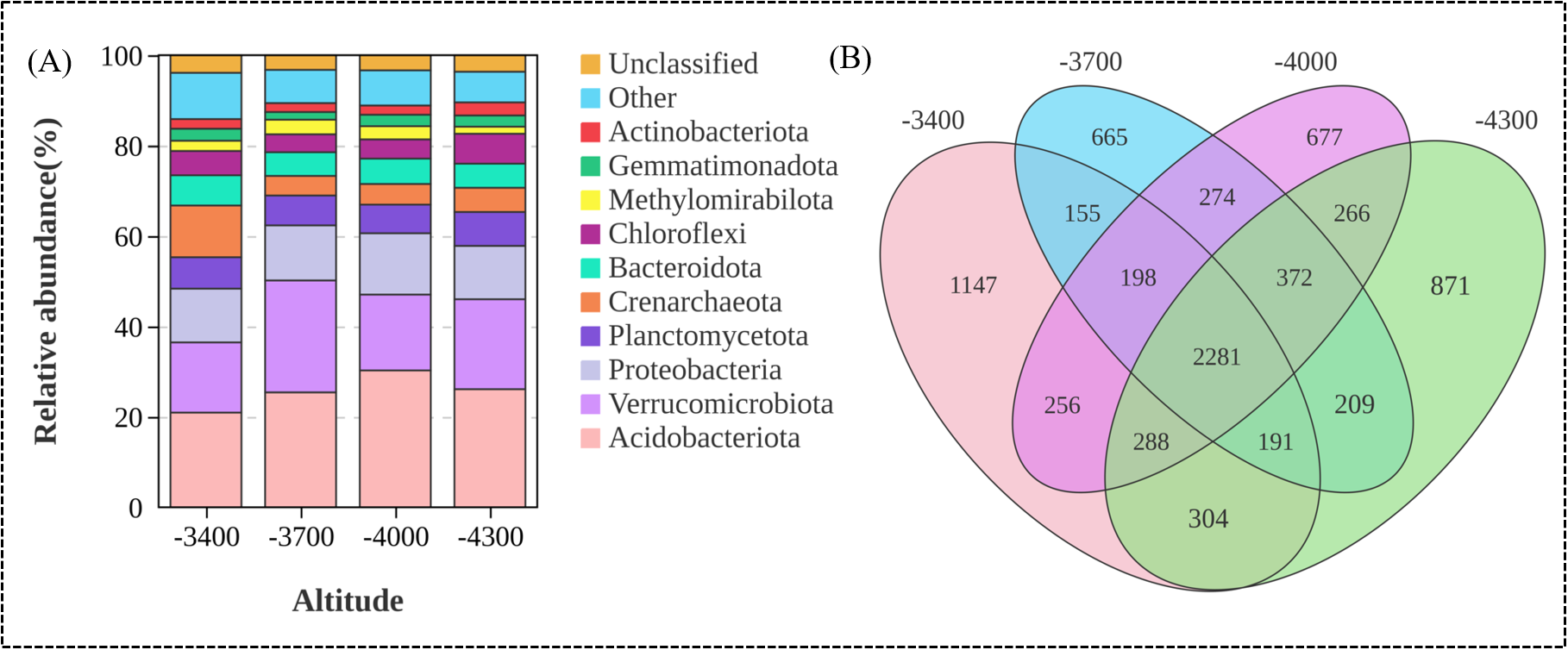 A total of 2281 operational taxonomic units (OTUs) were identified. The number of OTUs at different altitudes was 4820 (3400 m), 4345 (3700 m), 4612 (4000 m), and 4782 (4300 m), respectively. Correspondingly, the number of unique bacterial OTUs at these altitudes was 1147 (3400 m), 665 (3700 m), 677 (4000 m), and 871 (4300 m), respectively.