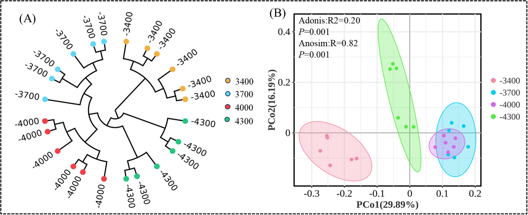 Arithmetic average unweighted paired grouping (UPGMA) clustering (A), principal coordinate analysis of bacterial community diversity at different altitude gradients (B).