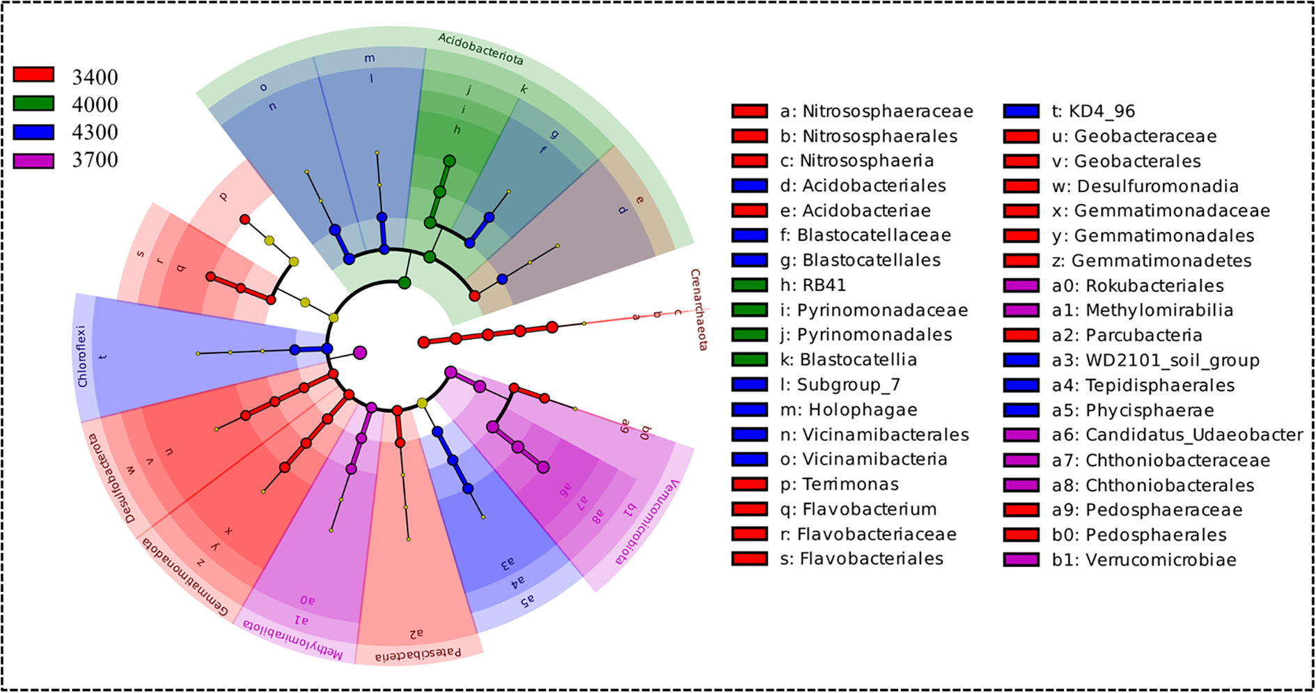 LefSe analysis showed that altitude significantly changed the bacterial community. Specifically, at the level of phylum, class and genus, some bacterial groups are significantly enriched at different altitude gradients (Figure 6). The number of indicator bacteria at each altitude is as follows: 3400 (22), 3700 (9), 4000 (5) and 4300 (12) for 22 kinds of indicator bacteria determined by LDA>2.0. Most bacterial groups are mainly concentrated at an altitude of 3400 m. Specifically, at the phylum level, Crenarchaeota, Patescibacteria, Desulfobacterota and Gemmatimonadota are indicator bacteria at an altitude of 3400 m. Verrucomicrobiota and Methylomirabilota are indicator bacteria at an altitude of 3700 m. Acidobacteriota is an indicator bacterium at an altitude of 4000 m. Chloroflexi is an indicator bacterium at an altitude of 4300 m.