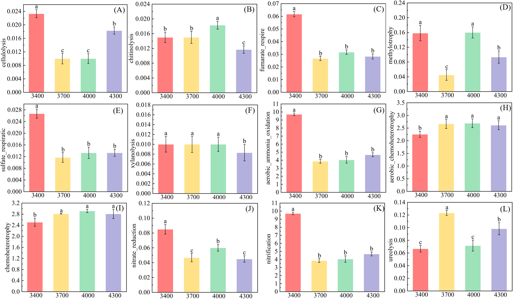 Changes of functional groups of soil bacteria at different altitudes. Different letters indicate significant differences between treatments (P< 0.05). (A) cellulolysis, (B) chitinolysis, (C) fumarate_respire, (D) methylotrophy, (E) sulfate_respiratic, (F) xylanolysis, (G) aerobic_ammonia_oxidation, (H) aerobic_chemoheterotrophy, (I) chemoheterotrophy, (J) nitrate reduction, (K) nitrification, (L) ureolysis.