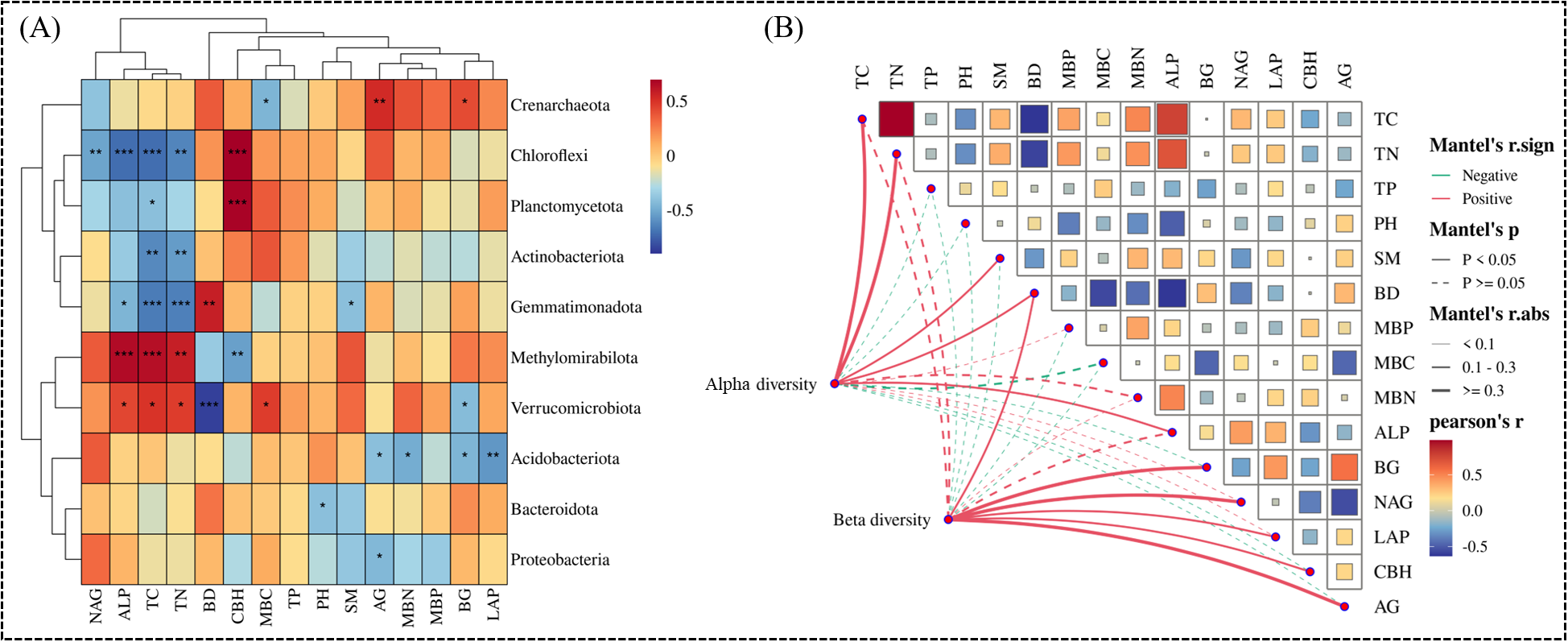 Thermal map of Spearman correlation coefficient between the top 10 dominant bacteria and soil factors (A). Mental test of the relationship between α and β diversity and environmental factors (B). *P<0.05,**P<0.01,***P<0.001.