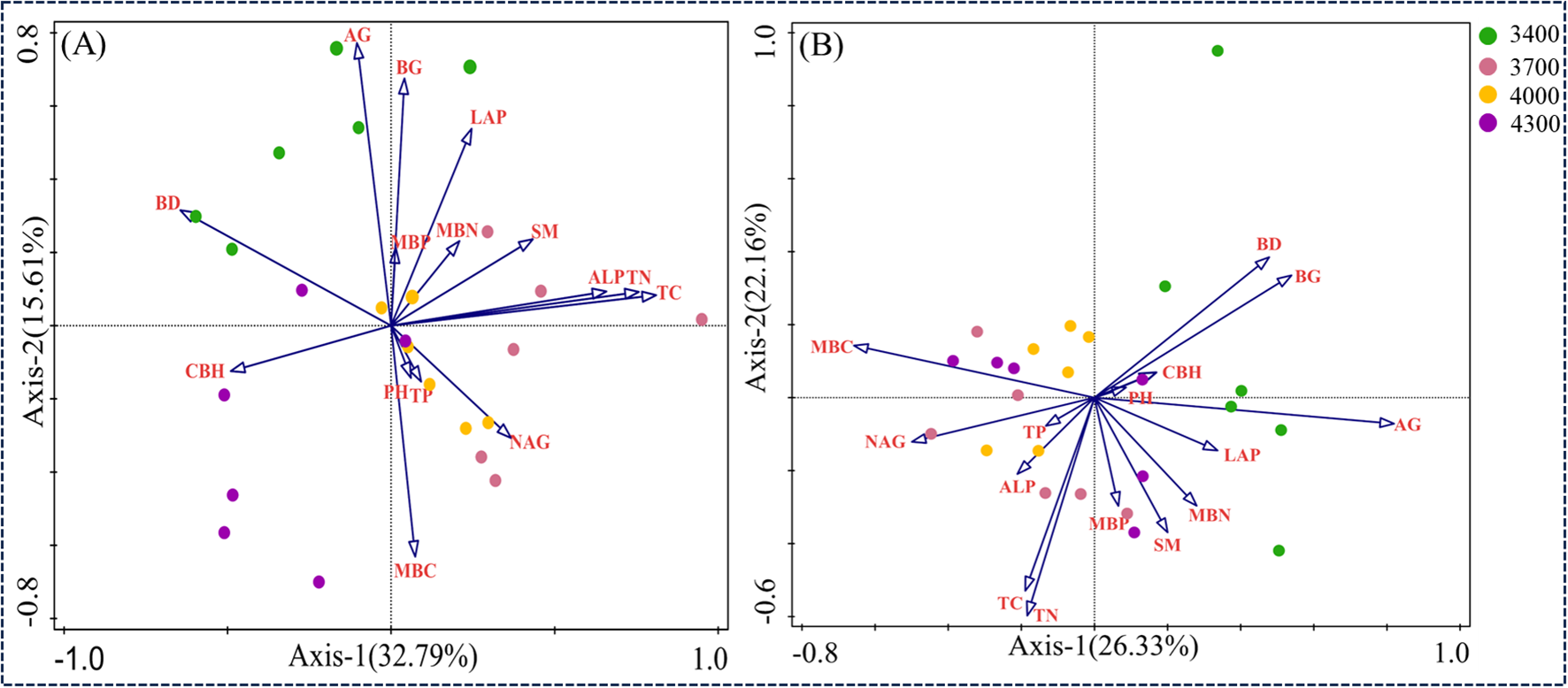 Soil properties and extracellular enzyme activities are the key factors affecting microbial communities at different altitudes. It is very important to understand their distribution patterns along the elevation gradient for predicting the function of alpine ecosystems in response to climate change, especially in alpine shrub ecosystems, which are rarely studied.