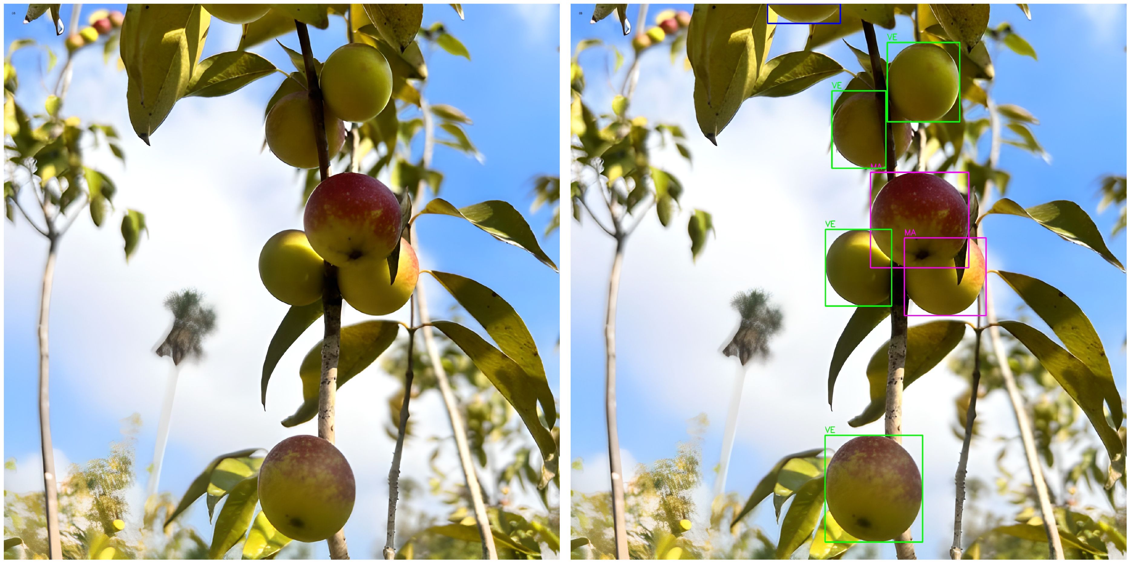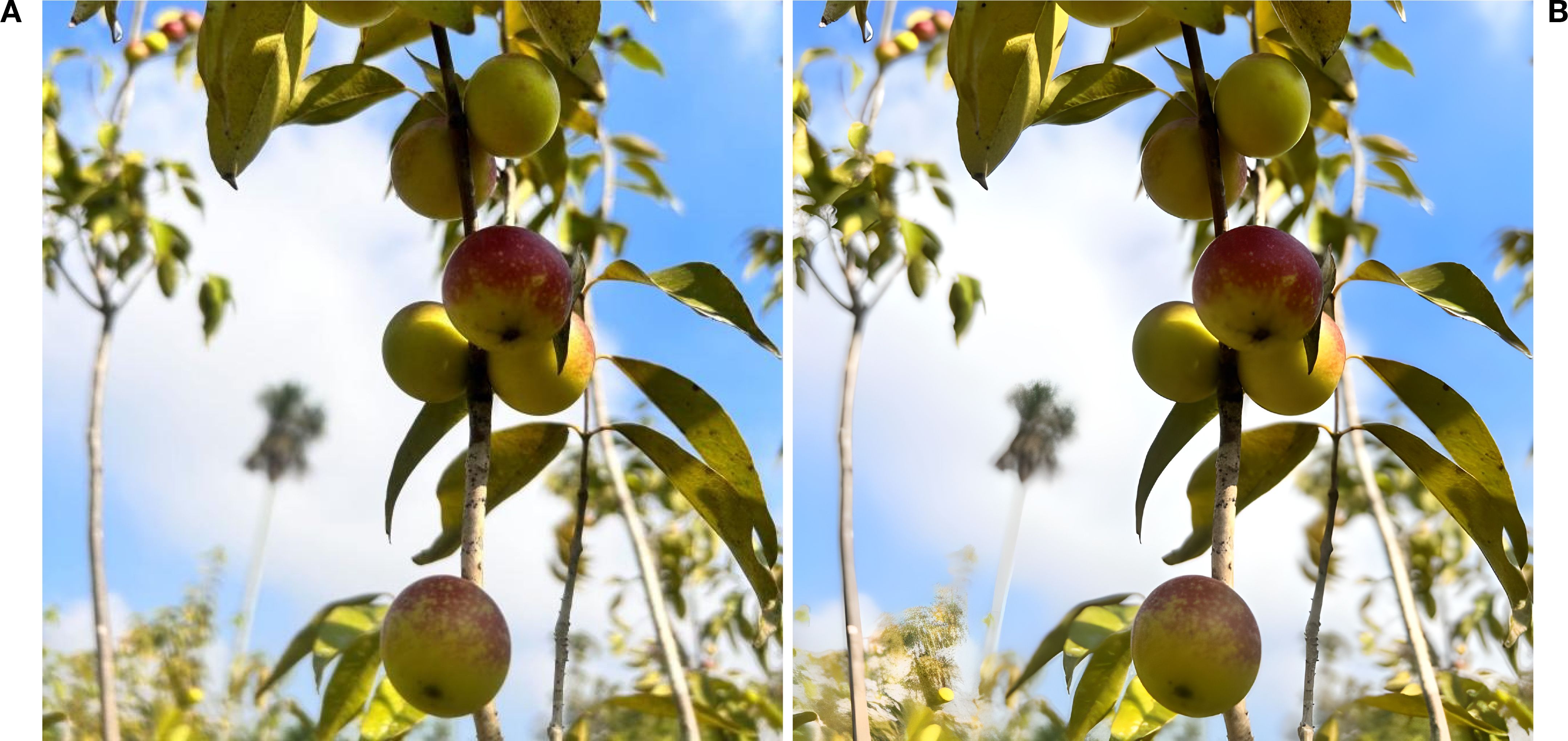 Figure 2. Comparison of image resolution and detection. (A) Original image. (B) Super-resolved image using GANs, showing enhanced clarity and detail for Camu-Camu fruits.
