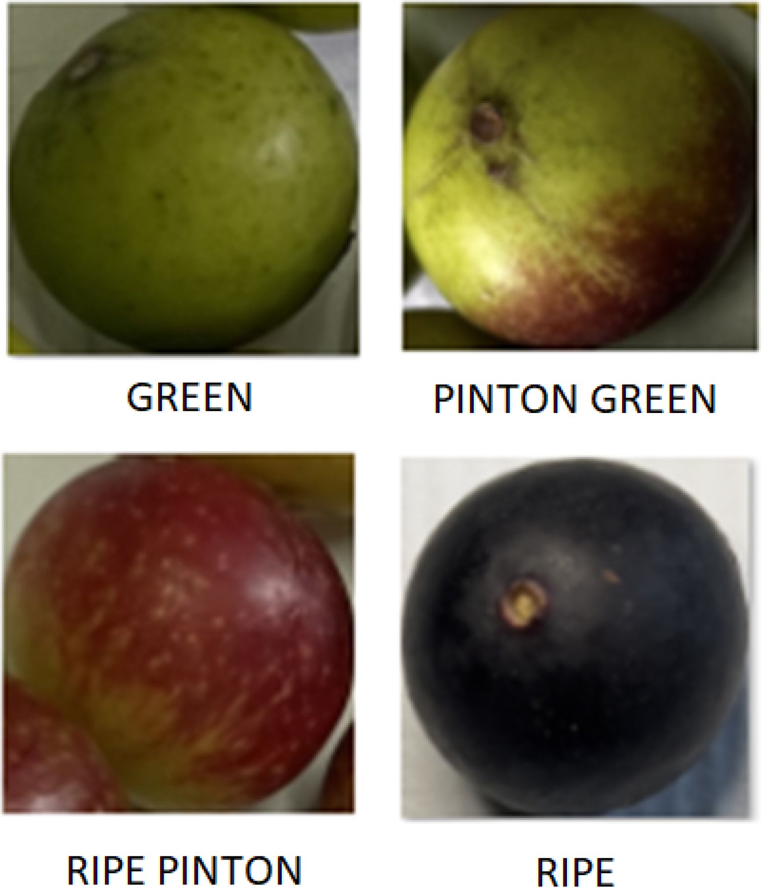 Examples of the four ripening stages green, Pinton Green, Ripe Pinton, and ripe are shown in Figure 6. These samples illustrate the visual differences used as the basis for classification.