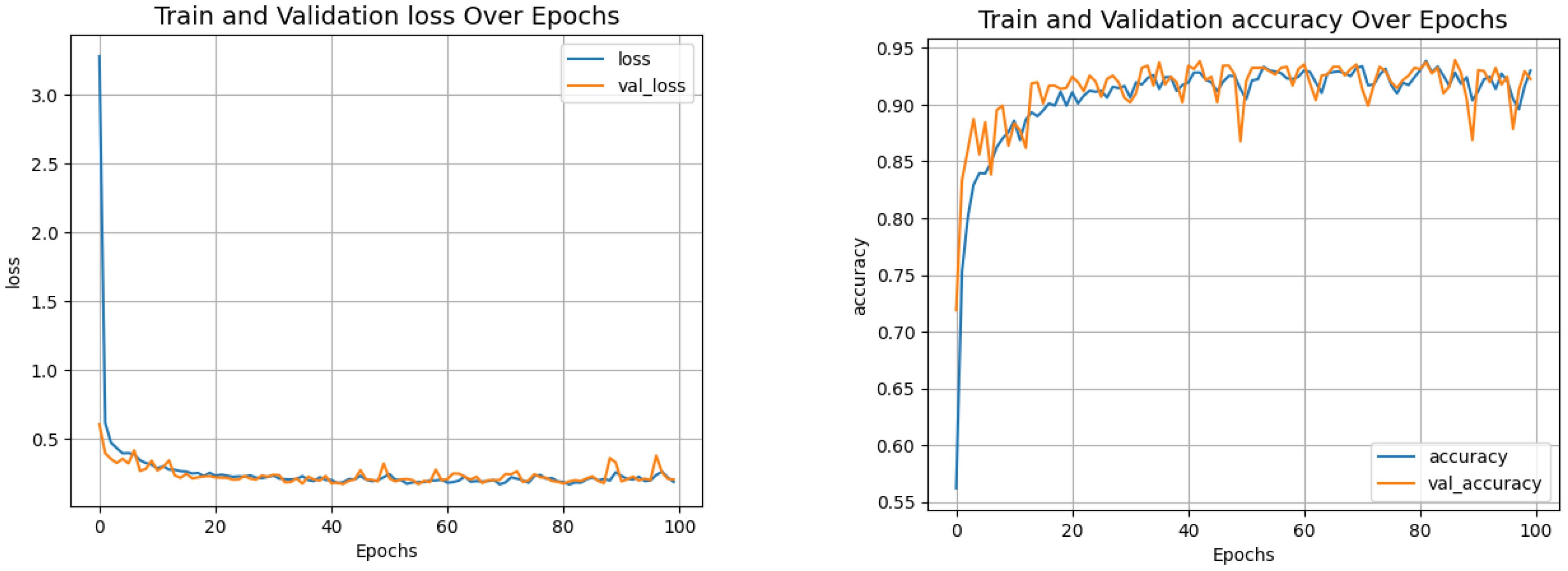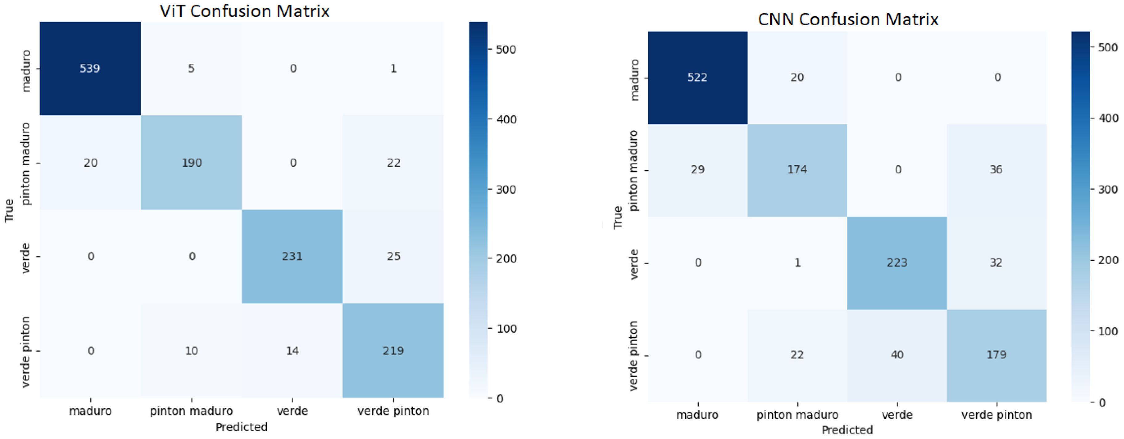 Figure 8 shows the loss and accuracy curves, indicating convergence after approximately 20 epochs. Figure 9 presents the confusion matrices comparing the ViT and VGG16 models. Although VGG16 achieved solid results, ViT consistently outperformed it.