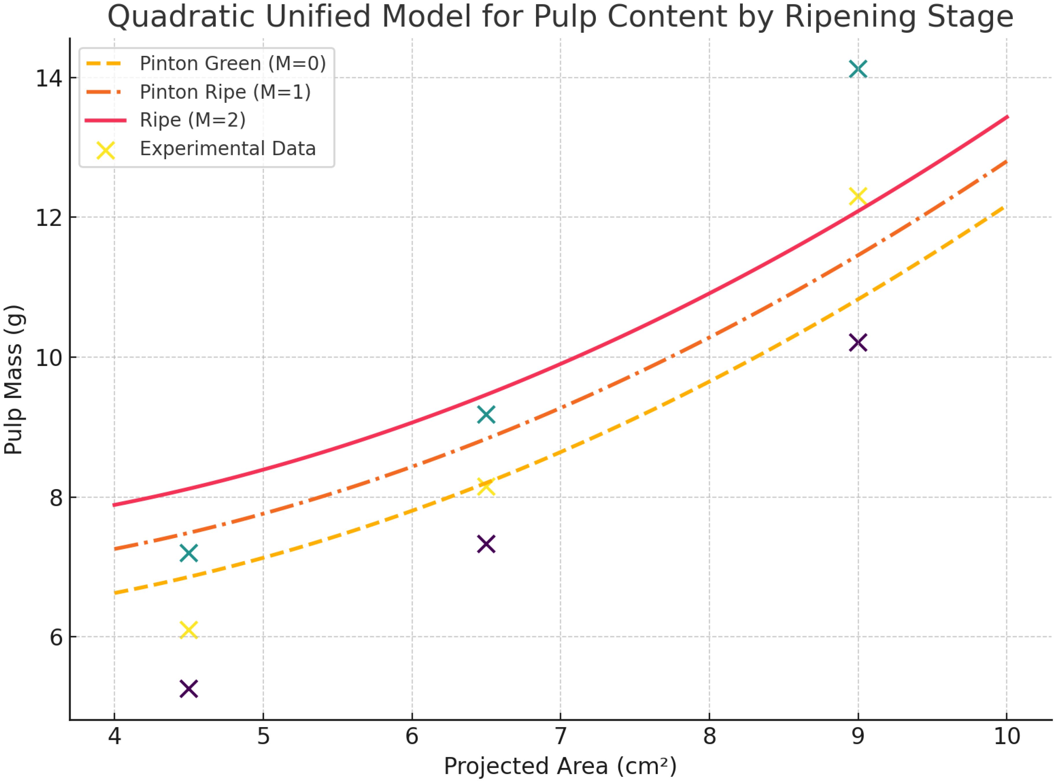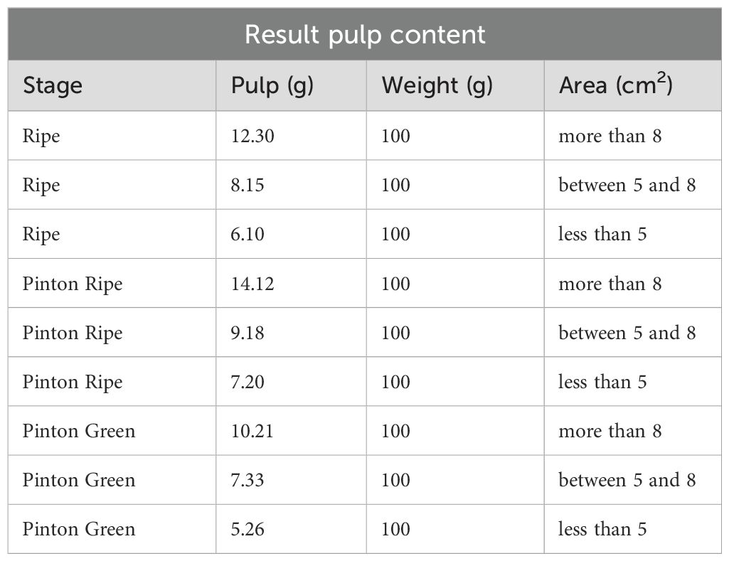 For each sample, the projected fruit area was recorded, and the pulp was manually separated and weighed. This manual calibration approach enabled the derivation of an empirical relationship between the measured area and the corresponding pulp yield, avoiding reliance on computational estimation models (Table 6).