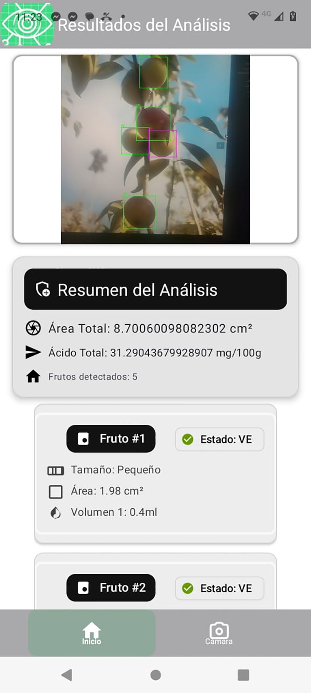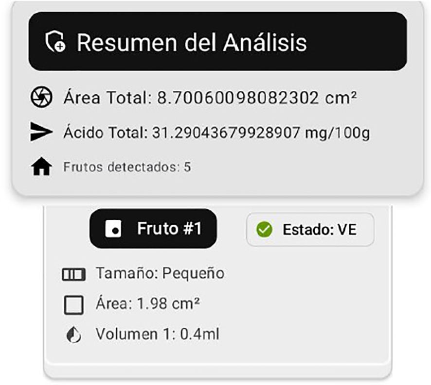 The results are presented in two parts, focusing on fruit detection and classification. For each processed image, the system automatically estimates the ascorbic acid content based on the criteria described in the previous section.
