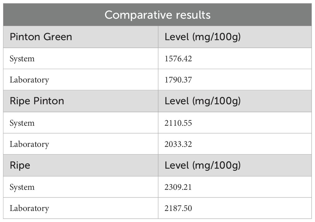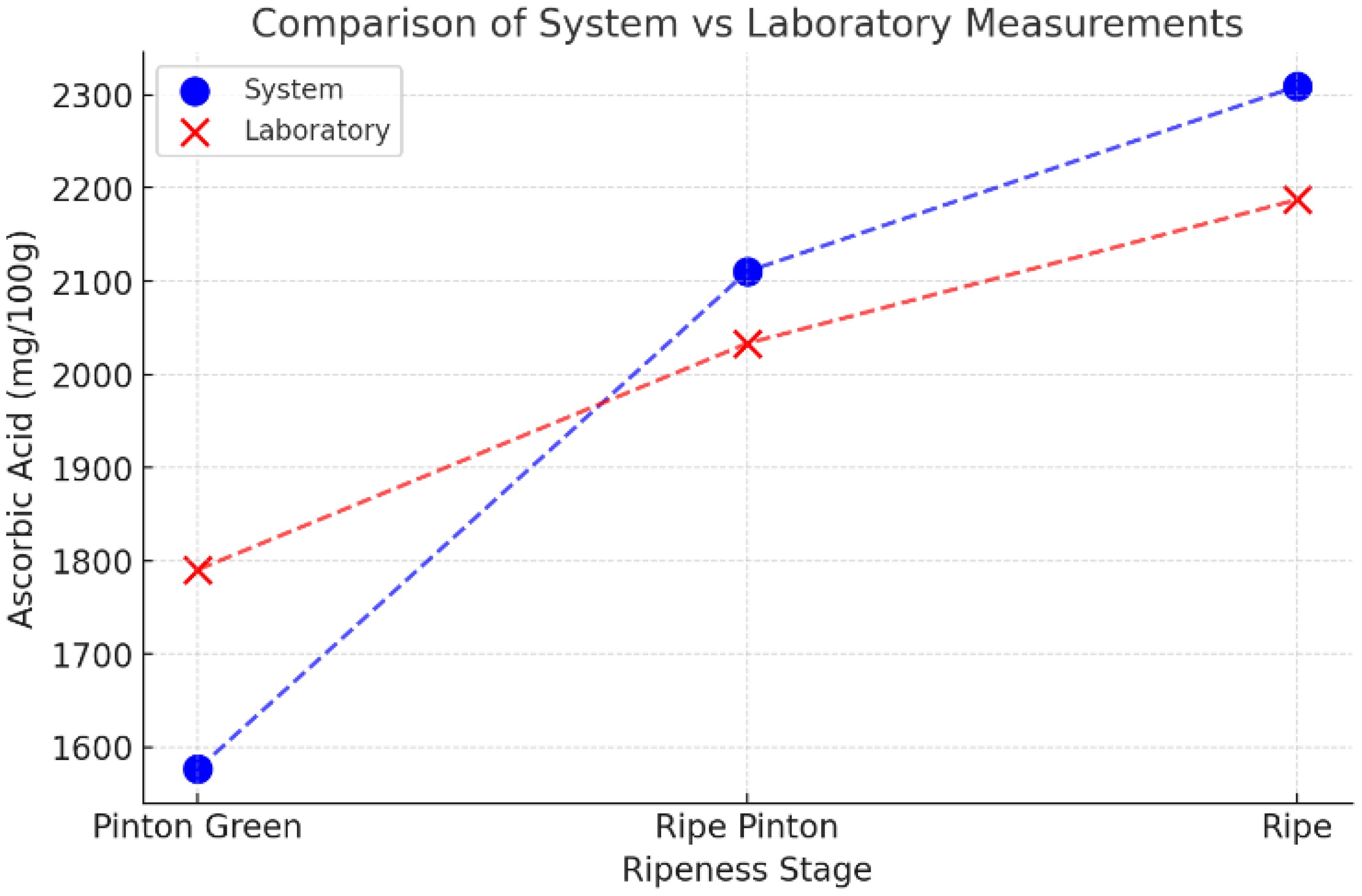 Certified reference analyses were carried out by Natura Analítica S.A.C. (an accredited testing laboratory), yielding ascorbic acid concentrations of 1539.40mgAA/100g (Green), 1790.37mgAA/100g (Turn–Green), 2033.32mgAA/100g (Turn–Ripe), and 2187.50mgAA/100g (Ripe). These certified values were used to validate our automated estimates, as summarized in Table 3.
