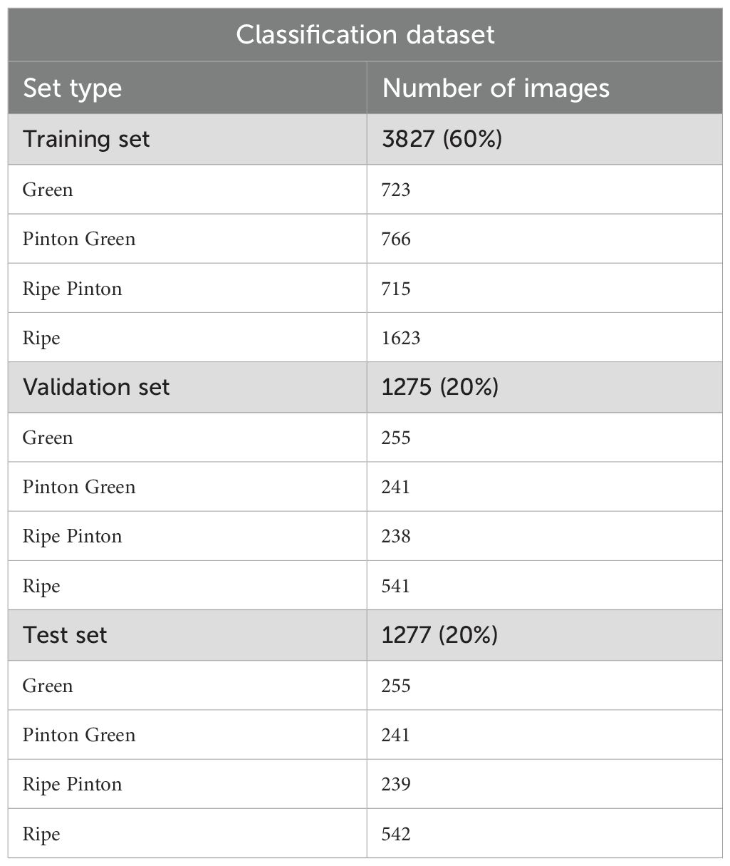 Table 2 presents the detailed distribution of images across the training, validation, and test sets, including the number of samples per ripening stage.