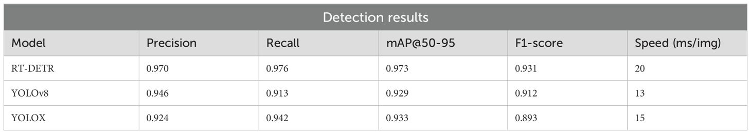 Although processing speed was not the main focus of this study, RT-DETR achieved 0.41 FLOPs, confirming its efficiency in terms of computational resources.