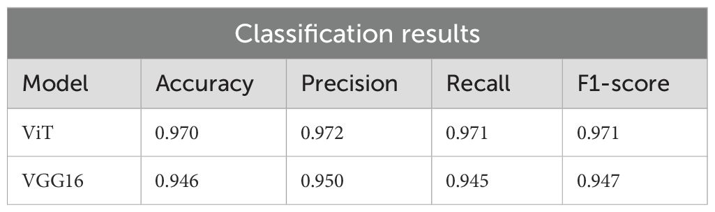 Table 5 shows the classification results. ViT achieved a precision of 0.970, surpassing VGG16, which reached 0.946. These results confirm the advantage of transformer-based architectures over traditional CNNs for this task.