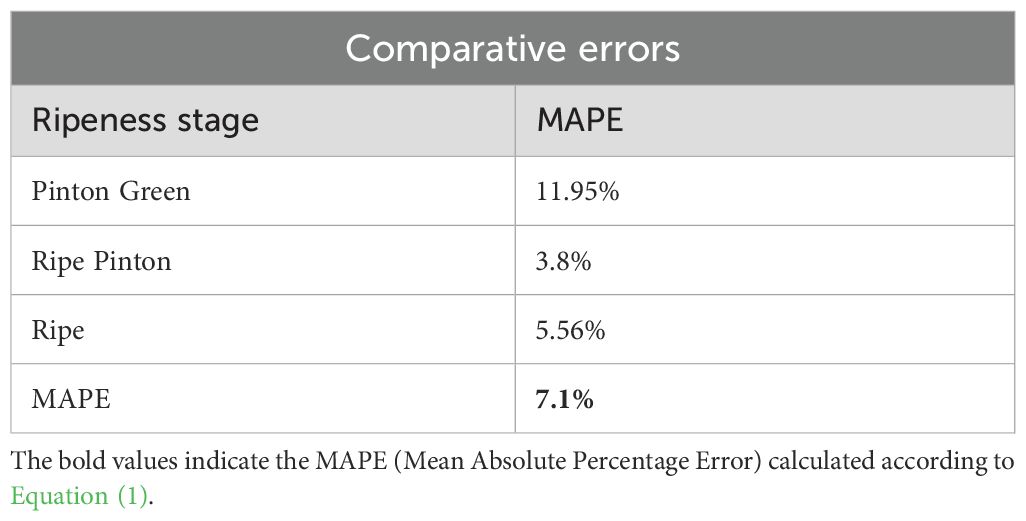 where are the results by laboratory values, are the predicted values, and is the total number of observations. Since green fruits are not used in practical commercialization, they were excluded from the error analysis. Table 7 summarizes the MAPE values for the remaining ripeness stages. The errors were slightly higher for the Pinton Green stage due to its color variability, while lower errors were achieved for Ripe and Ripe Pinton stages, making the system highly suitable for practical applications.