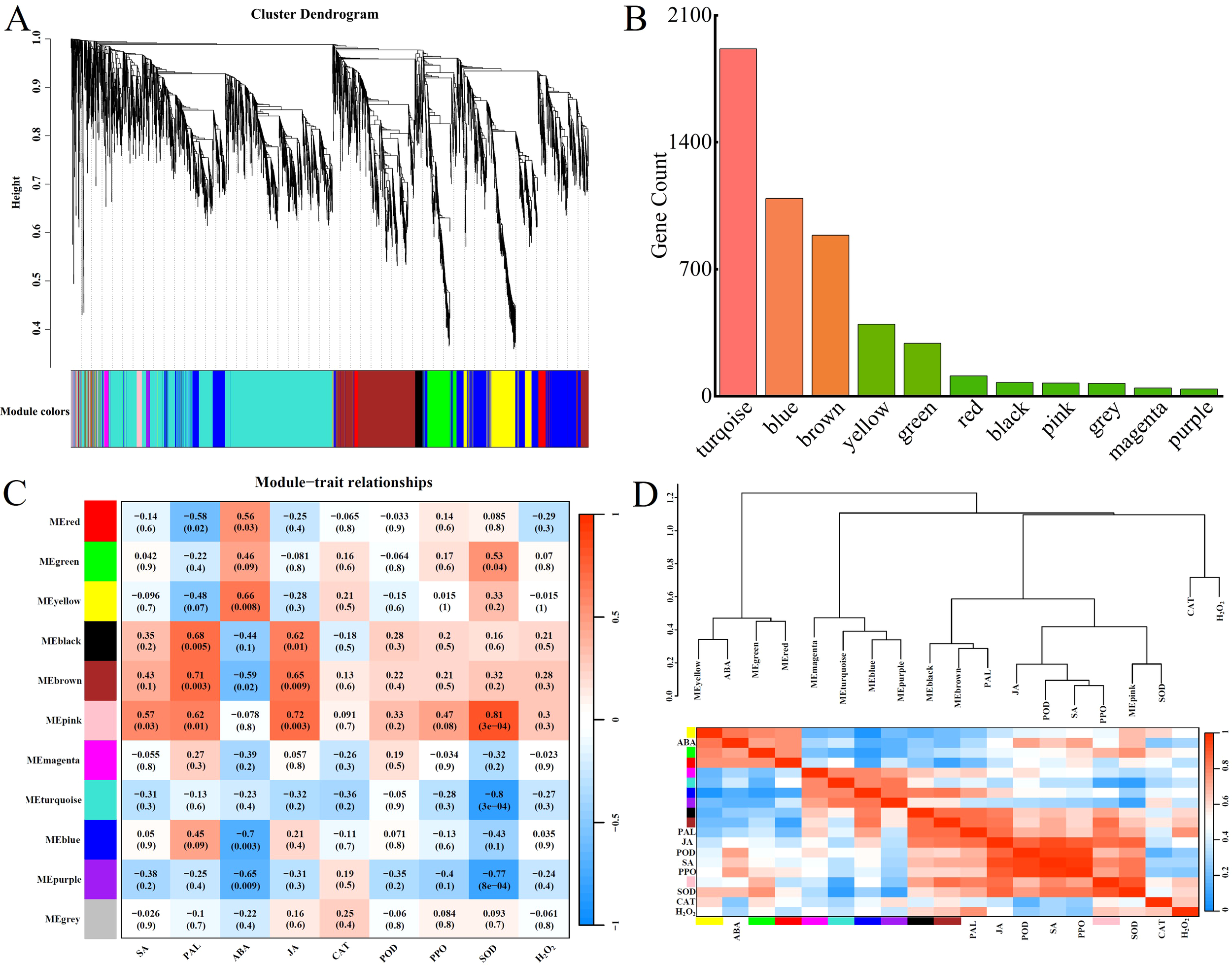 Constructing a clustering tree based on gene expression, we merge genes with similar expression patterns into the same branch. Then, based on the similarity of module feature values, we merge modules with similar expression patterns to obtain partitioned modules, which are represented by different colors (Figure 5A). Using WGCNA analysis, we performed correlation analysis and clustering based on the FPKM values of DEGs. The genes with higher correlation were assigned to the same module, and different colors in the figure represented different modules. Eventually, all the DEGs were classified into a total of 11 modules. The number of genes in each module is shown in Figure 5B. Moreover both up-regulated and down-regulated genes were present in each module, and the heat map gene co-expression networks are shown in Figure 5C. Based on the correlation analysis of the trend of gene expression modules with disease resistance traits, Pearson’s correlation coefficient (|R| > 0.6) and the magnitude of the significant P-value (P < 0.05) were used as the screening criteria, and it was found that the yellow module, the black module, the brown module, and the pink module were significantly and positively correlated with physiological and biochemical indicators. Among them, the yellow module was positively correlated with ABA, the black module was positively correlated with PAL and JA, the brown module was positively correlated with PAL and JA, and the pink module was positively correlated with PAL, JA, and SOD. Physiological and biochemical indicators are also clustered together (Figure 5D). The results indicate that the characterized genes of these four modules are likely to be associated with resistance to Populus simonii × P. nigra against A. alternata.