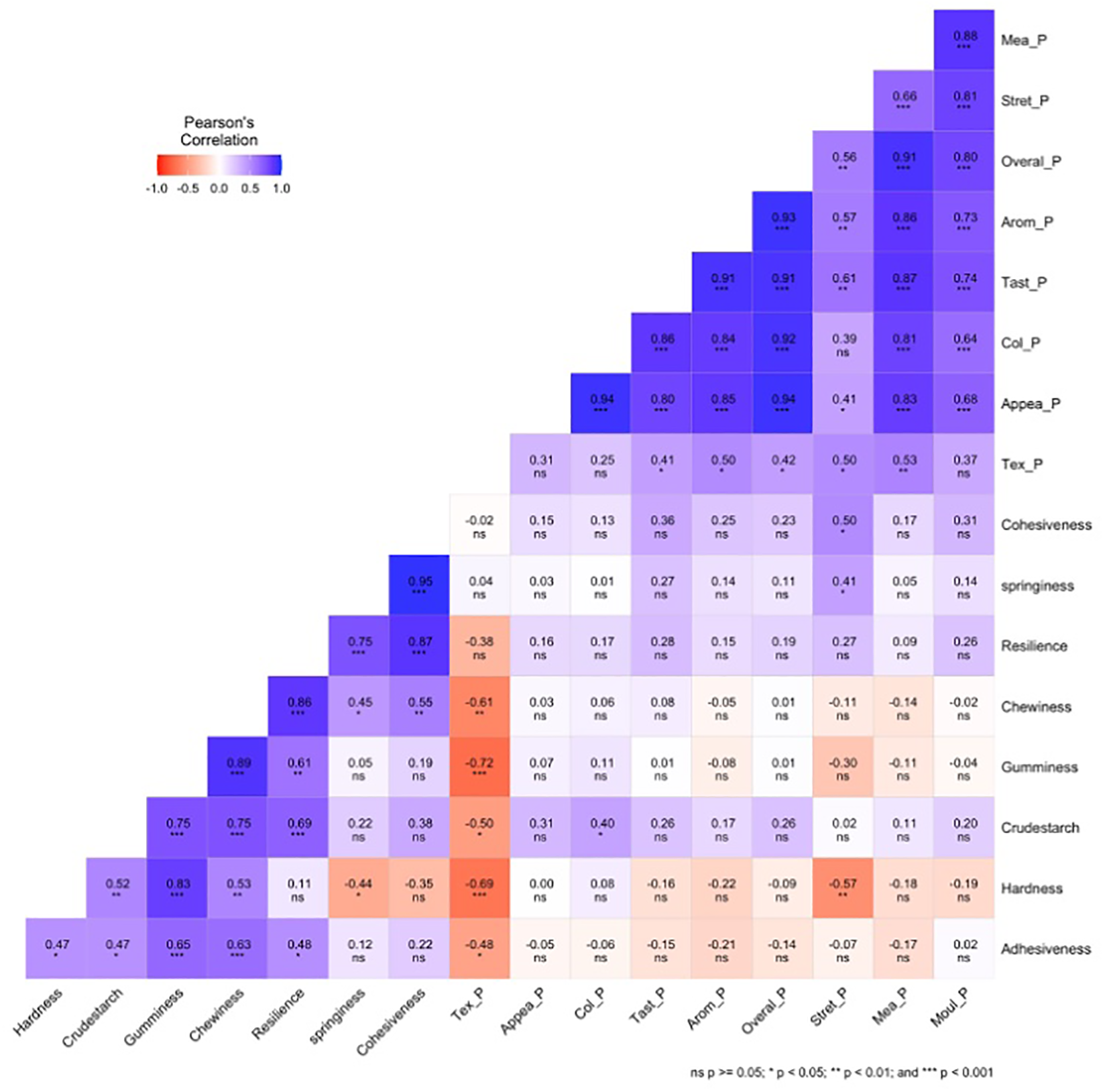 Figure 3. Pearson correlation coefficient among the ITPA, sensory pounded, and crude starch for 25 white yam genotypes. Tex_P, texture pounded-yam; Mea_P, mealiness pounded-yam; Appea_P, appearance pounded-yam; Col_P, color pounded-yam; Arom_P, aroma pounded-yam; Tast_P, taste pounded-yam; Stret_P, stretchability pounded-yam; Mol_P, moldability pounded-yam; Overal_P, overall acceptability pounded-yam.