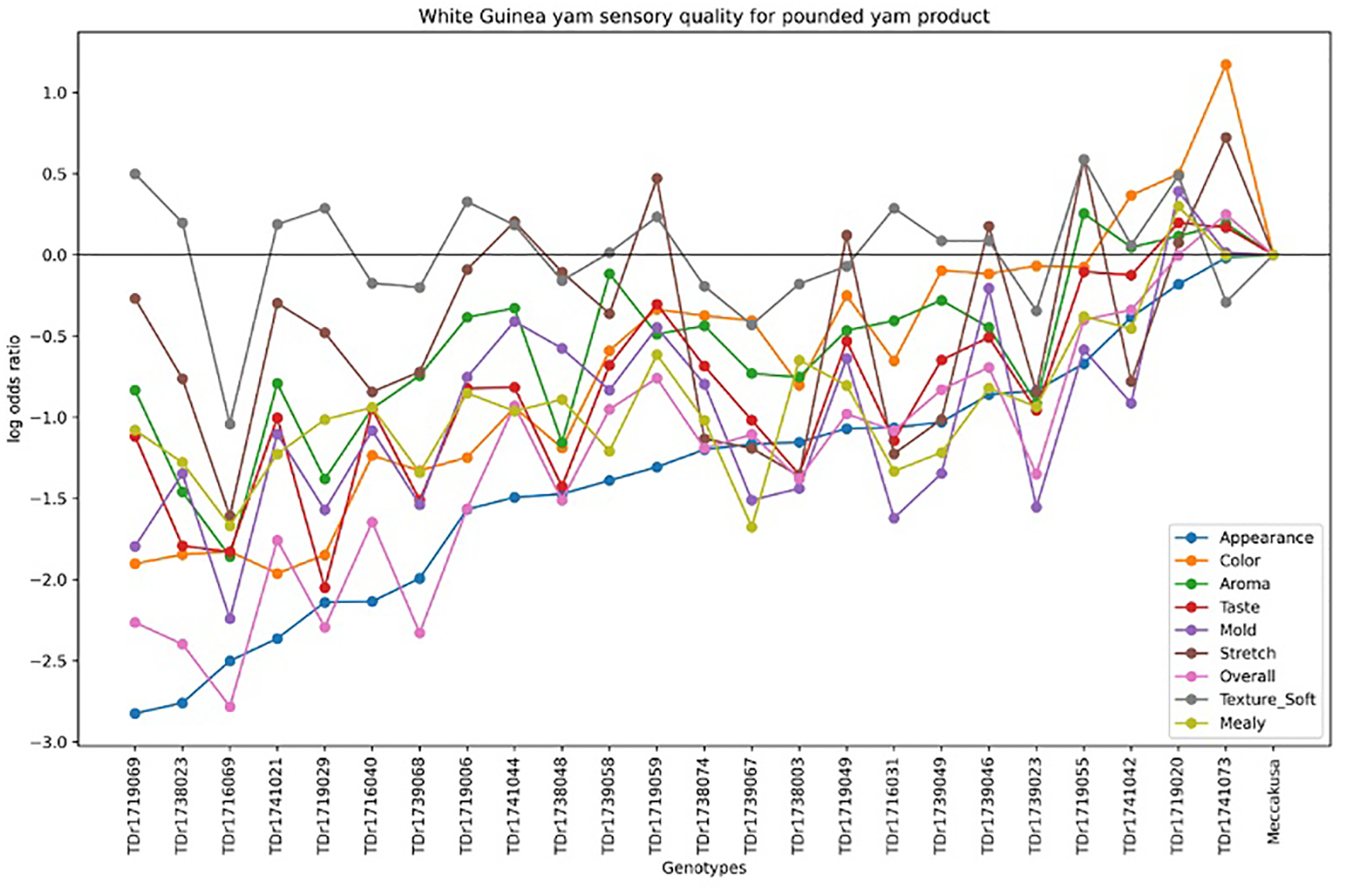 Figure 4 illustrates the variation in sensory quality among yam genotypes evaluated for pounded yam. The x-axis represents the different genotypes, with Meccakusa as the baseline reference, while the y-axis displays the log-odds ratio, reflecting the likelihood of a sensory attribute being perceived in each genotype relative to the baseline. The different colors correspond to the sensory attributes measured for pounded yam quality. The log-odds ratios varied across genotypes, highlighting differences in sensory qualities. Among the genotypes, TDr1741073 was perceived as having the best sensory quality for pounded yam compared to the baseline, Meccakusa.