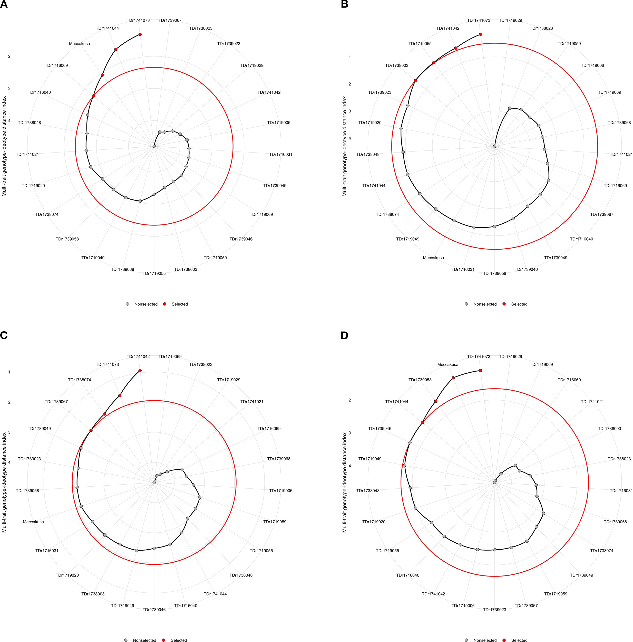 Figure 6. (a–d) Genotypes ranking and selection using the factor analysis and MGIDI index. The selected genotypes are shown in red and the unselected in black circles. The circle represents the cut-point according to the selection pressure.