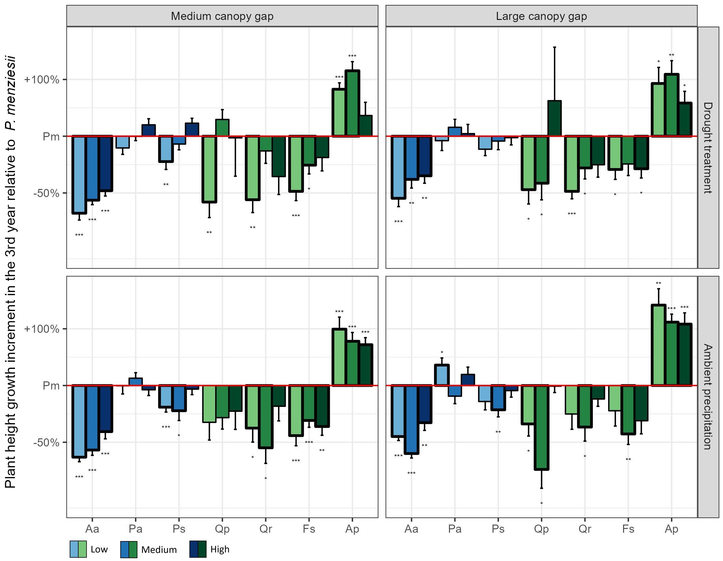 Plant height growth increment in the 3rd year of the experiment for the seven native plant species compared to Douglas fir across all possible light, water, and nutrient treatments. The values of all native plant species were standardized by the corresponding value of Douglas fir in the same treatment combination. Low, medium, and high indicate the three nutrient levels. Aa = Silver fir, Pa = Norway spruce, Ps = Scots pine, Pm = Douglas fir, Qp = Sessile oak, Qr = Pedunculate oak, Fs = European beech, Ap = Sycamore. *p < 0.05, **p < 0.01, ***p < 0.001.