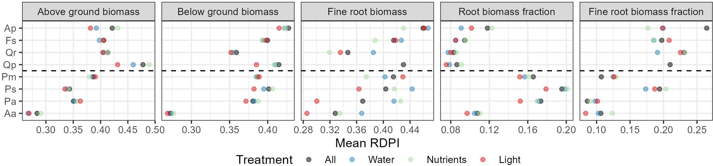 Relative Distance Plasticity Index (RDPI) of the eight different tree species and across the different treatments. All = Across all treatment combinations, Water = Water availability (2 levels), Nutrients = Nutrient availability (3 levels), Light = Light availability (2 levels). Aa = Silver fir, Pa = Norway spruce, Ps = Scots pine, Pm = Douglas fir, Qp = Sessile oak, Qr = Pedunculate oak, Fs = European beech, Ap = Sycamore.