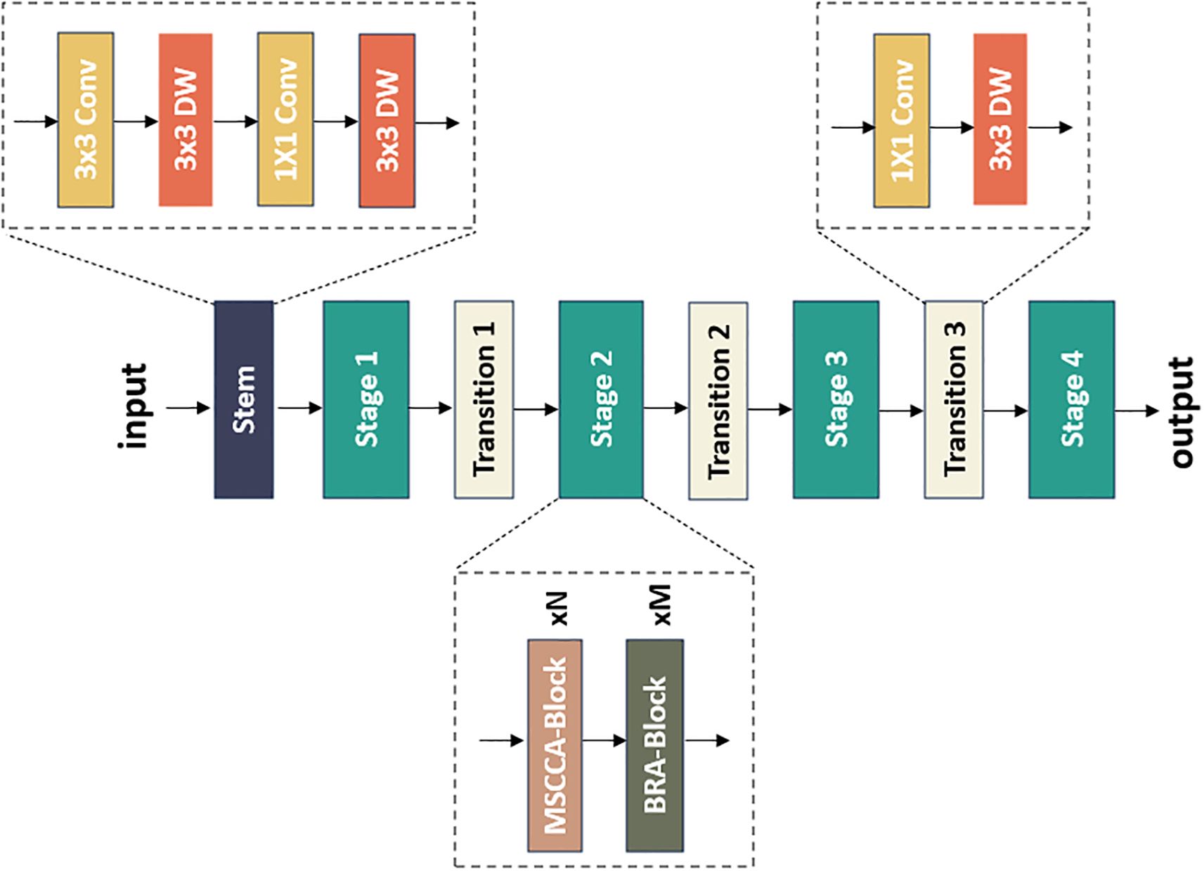 Flowchart of a neural network architecture with stages and transitions. It begins with “Input,” followed by a “Stem” block. It progresses through four stages, each divided by transitions. Each stage contains a repeated block structure. Additional blocks labeled “MSCCA-Block” and “BRA-Block” at the bottom. The process concludes with “Output.