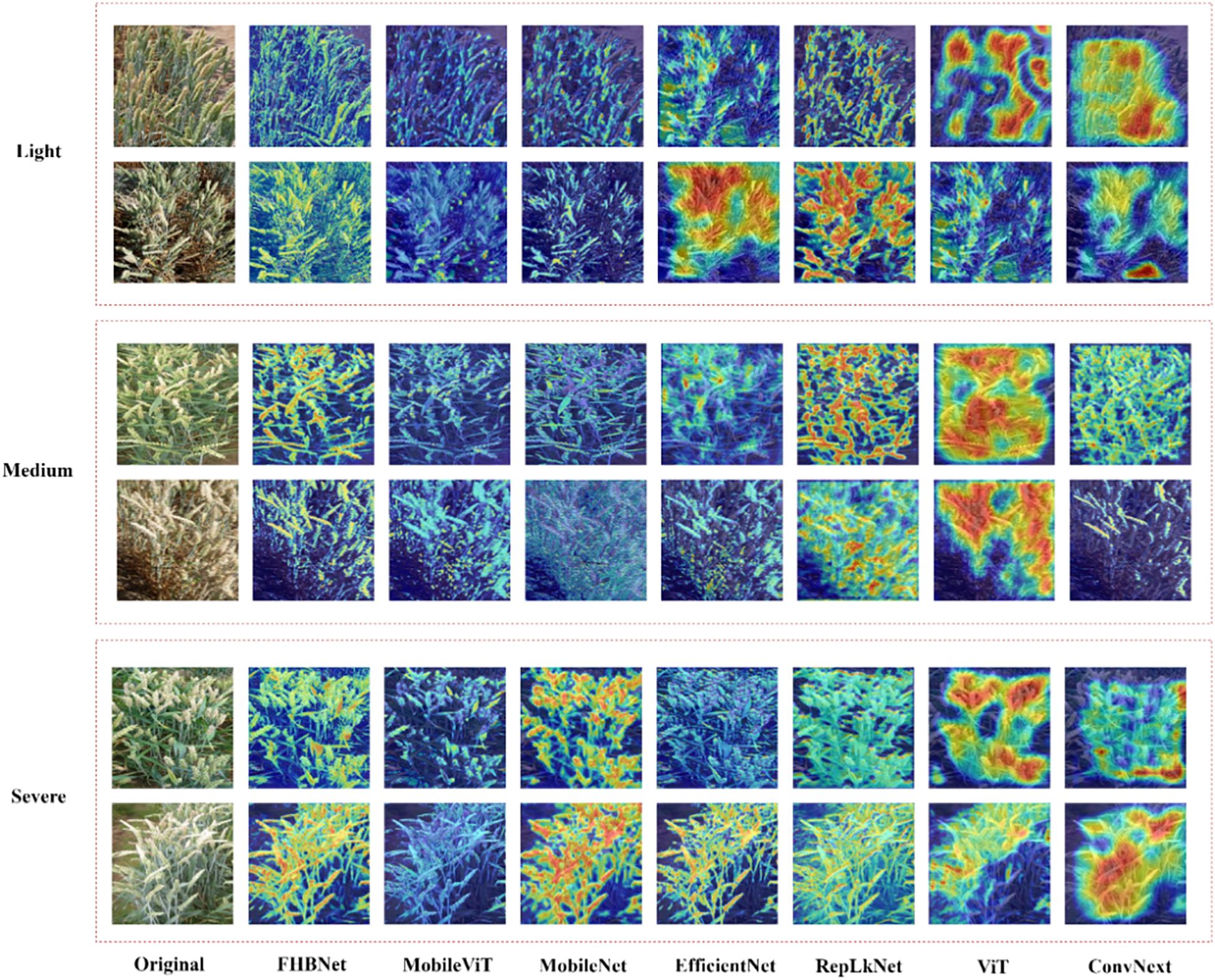 Comparison of original images and heatmaps for three disease severity levels: light, medium, and severe. Each level includes an original image and heatmaps generated by different models: FHBNet, MobileViT, MobileNet, EfficientNet, RepLKNet, ViT, and ConvNext. The heatmaps display varying levels of intensity, highlighting regions affected by the disease.