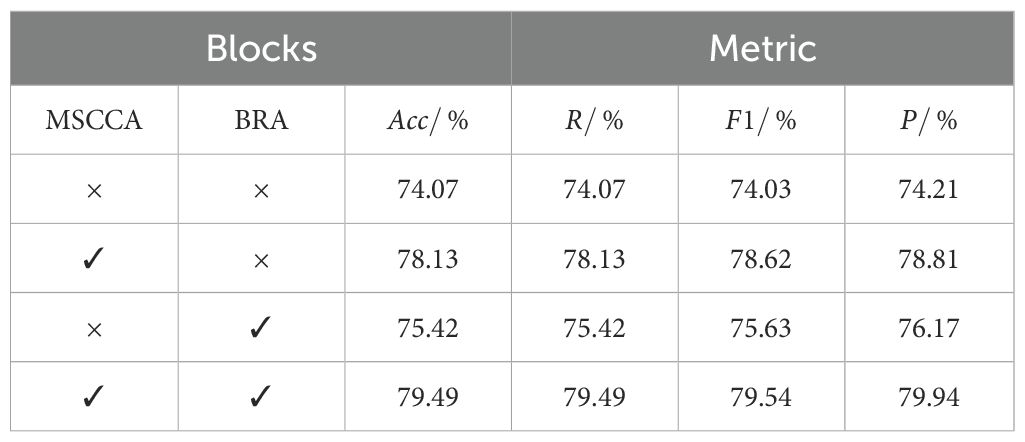 We proposed a novel model, namely FHBNet, that can accurately identify infected wheat spikes and determine the severity level of FHB. The overall architecture was depicted in Figure 2. The original image first entered the Stem layer, where a series of convolutional layers were stacked. After passing through the first 3×3 convolutional layer with a sampling rate of 2, we used a depth-wise separable 3×3 convolutional layer to capture the low-level features. Next, a 1×1 convolutional layer and a depth-wise separable 3×3 convolutional layer was employed to perform the downsampling operations. The image then progressed through the Stage layer, which was the core of FHBNet. It was responsible to locate the wheat spikes and extract the FHB features. The Stage layer included the MSCCA and BRA blocks, which will be elaborated in subsequent sections. The number of blocks in each stage was presented in Supplementary Table S1. It was worth mentioning that Stage 3 contained 18 MSCCA blocks, more than any other stage. This was due to the reason that in deep network architectures, deeper layers were often responsible for extracting more abstract features. Located in the deeper layers of FHBNet, Stage 3 dealt with more complex feature information. The MSCCA block, with its multi-scale and attention mechanism, effectively enhanced the model’s ability to abstract and represent features, enabling FHBNet to better understand and process the high-level semantic information. Last, the Transition layer served as a bridge between each stage, acting as an independent downsampling layer that doubled the channel dimensions and halved the image size.