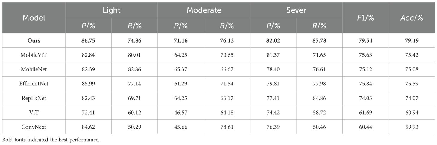 The results indicated that FHBNet achieved excellent performance, surpassing the second-best performing model by 3.7% in accuracy. We also observed that all models exhibited the lowest accuracy in recognizing moderate infection, as the complexity of the image background increased with healthy wheat and infected wheat intermingled, which interfered with the models’ discriminative capabilities.