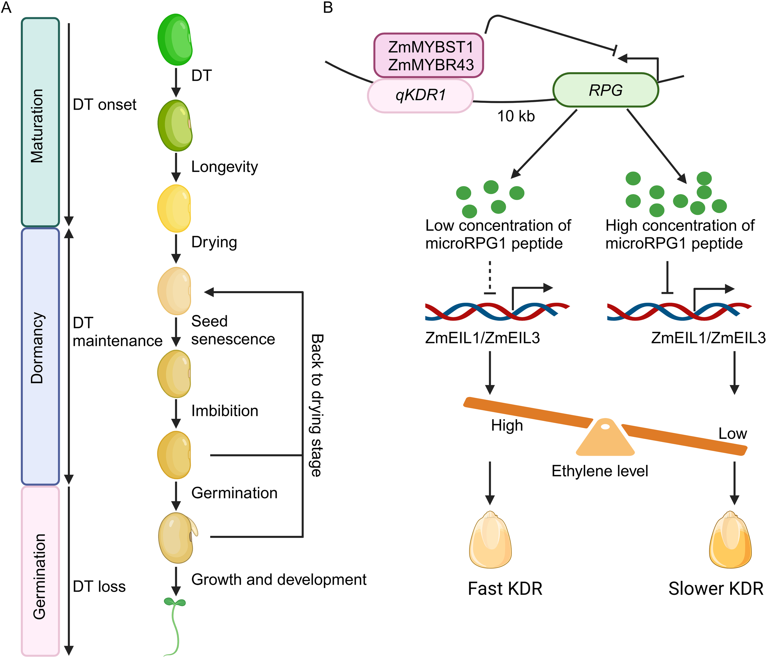 The microRPG1 peptide modulates seed desiccation through ethylene signaling pathways. (A) Key developmental phases in seed life. The establishment of desiccation tolerance (DT) occurs during the late maturation phase, subsequently followed by developmental processes that promote longevity during the dormancy period. Maturation drying leads to a reduction in seed moisture levels. DT is maintained by intricate networks during dormancy. Optimal conditions of low temperature and humidity prolong seed viability, whereas less favorable environmental conditions contribute to seed senescence. Water imbibition triggers metabolic activities and cellular processes, culminating in germination. Cutting-edge technologies rehydrate seeds, followed by desiccation, to enhance cellular repair and boost seed vigor. DT is lost when seeds progress to germination. (B) Mechanistic model of microRPG1 peptide in seed desiccation. RPG encodes a peptide, namely microRPG1, comprising 31 amino acids. Two MYB transcription factors, ZmMYBSt1 and ZmMYBR43, interact with the qKDR1 locus, thereby repressing the transcriptional activity of RPG and the levels of microRPG1 peptide. The microRPG1 peptide subsequently regulates the expression of ZmEIL1 and ZmEIL3, pivotal transcription factors in the ethylene signaling cascade, thereby modulating ethylene signaling and KDR. Elevated ethylene concentrations facilitate KDR, while reduced ethylene levels deaccelerate KDR. The figure is adapted from Yu et al., 2024. Dashed line means weak effect. The figure is created via biorender.com.