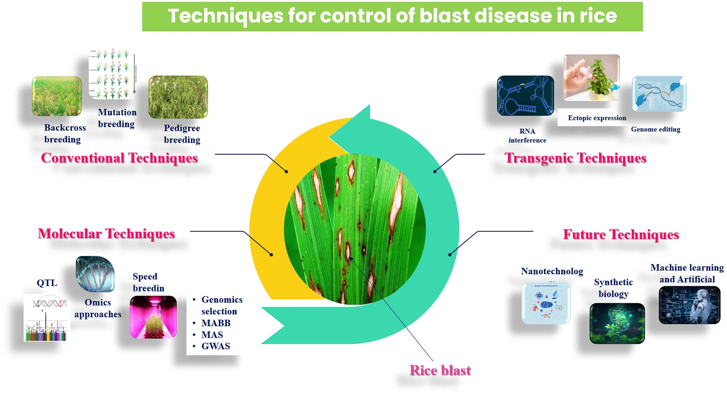 The management of rice blast disease primarily relies on traditional breeding techniques, such as pedigree, backcross, mutation, and recurrent selection, which often face challenges with linkage drag, where undesirable traits are inadvertently transferred along with resistance genes. These conventional methods have limitations in effectively controlling blast disease and are associated with high labor costs and a time-consuming process. Consequently, researchers have employed molecular markers to identify blast resistance using various techniques, including QTL mapping, genetic transformation, and marker-aided selection (MAS). Integrating marker-assisted selection (MAS) with traditional breeding methods has enabled the accumulation of R genes in elite rice cultivars, enhancing their resistance to blast and improving durability. These approaches involve enhanced selection processes that focus on improved quality and desirable traits, leading to the development of blast-resistant rice varieties (Ashkani et al., 2015). Thus, understanding the molecular interactions between the pathogen and the host plant is essential to develop effective strategies to manage and control rice blast disease. Additionally, recent studies have identified specific blast resistance genes, offering new opportunities for breeding programs (Ramkumar et al., 2015; Amoghavarsha et al., 2022). This review briefly examines conventional methods and molecular approaches such as transgenic techniques, CRISPR/Cas9 technology, nanotechnology, allele mining, and omics strategies that contribute to the management of rice blast disease, offering insights into its control.